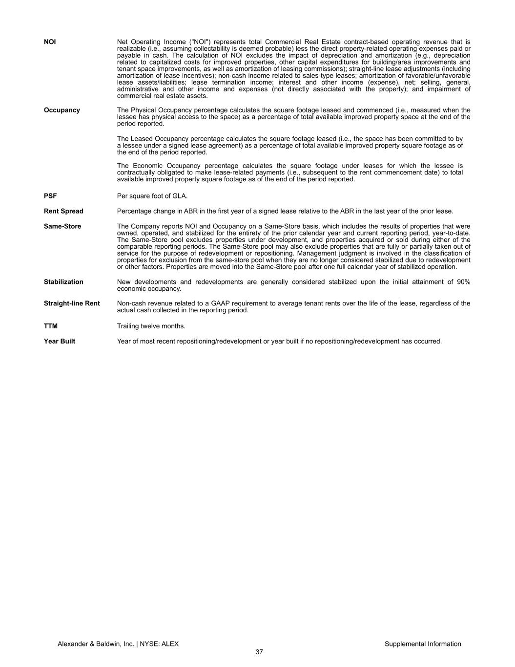 NOI净营业收入(“NOI”)指可变现(即假设可收回性被认为很可能)的基于商业房地产合同的营业收入总额减去以现金支付或应付的直接与财产相关的运营费用。NOI的计算不包括折旧和摊销的影响(例如,与改善物业的资本化成本相关的折旧、建筑物/面积改善和租户空间改善的其他资本支出,以及租赁佣金的摊销);直线租赁调整(包括租赁奖励的摊销);与销售类租赁相关的非现金收入;有利/不利租赁资产/负债的摊销;租赁终止收入;利息和其他收入(费用),净额;销售、一般、行政和其他收入和费用(不直接与物业相关);以及商业房地产资产的减值。占用情况实际占用百分比计算租赁和开工的建筑面积(即在承租人实际进入该空间时计量)占报告所述期间期末可用改善物业空间总量的百分比。租赁占用百分比计算租赁的面积(即承租人根据已签署的租赁协议承诺的空间)占截至报告期间结束时可用的改善物业总面积的百分比。经济占用百分比计算承租人根据合同有义务支付租赁相关款项(即在租金开始日期之后)的租赁项下的建筑面积与截至报告期间结束时的可用改善物业建筑面积总额。每平方英尺GLA的PSF。已签订租约第一年ABR相对于前一租约最后一年ABR的租金价差百分比变化。同店本公司以同店为基础报告NOI和入住率,其中包括去年至今整个上一个日历年和当前报告期间拥有、经营和稳定的物业的结果。同店池不包括发展中物业,以及在任一可比报告期间收购或出售的物业。同店池也可能排除为重新开发或重新定位而全部或部分停止服务的物业。当物业因重建或其他因素而不再被视为稳定时,管理层判断涉及将物业分类以排除在同店池之外。物业在稳定运营整整一年后移入同店池。稳定新发展和重建一般认为在初步达到90%的经济占用率时稳定下来。直线式租金非现金收入与GAAP要求相关的租赁期限内的平均租户租金,而不考虑报告期间实际收取的现金。TTM过去12个月。建成年份最近重新定位/重新开发的年份或未发生重新定位/重新开发的年份建成的年份。Alexander & Baldwin, Inc. | NYSE:ALEX补充信息37