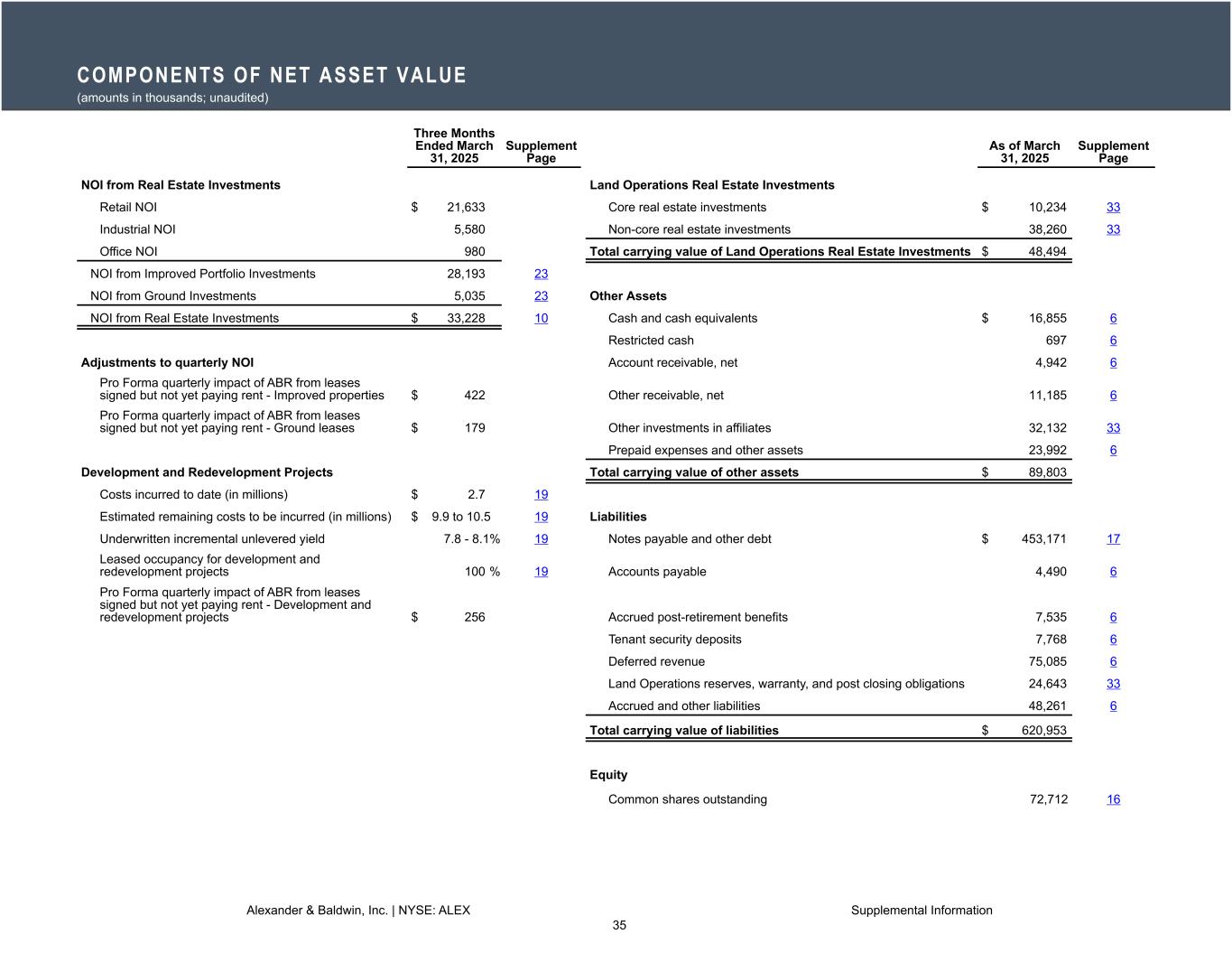 资产净值构成部分(金额以千为单位;未经审计)截至2025年3月31日止三个月补充页截至3月31日,2025年补充页NOI来自房地产投资土地运营房地产投资零售NOI 21,633美元核心房地产投资10,23433美元工业NOI 5,580非核心房地产投资38,26033办公室NOI 980土地运营房地产投资总账面价值48,494美元NOI来自改善的投资组合28,19323 NOI来自地面投资5,03523其他资产NOI来自房地产投资33,22810美元现金和现金等价物16,8556美元受限现金6976调整季度NOI应收账款,净额4,9426 ABR的备考季度影响来自已签订但尚未支付租金的租约-改善后的物业422美元其他应收款,净额11,1856 ABR的预估季度影响来自已签署但尚未支付租金的租赁-地面租赁179美元对附属公司的其他投资32,13233预付费用和其他资产23,9926开发和再开发项目其他资产的总账面价值89,803美元迄今已发生的成本(百万美元)2.7 19估计剩余将发生的成本(百万美元)9.9美元至10.5美元19负债包销的增量无杠杆收益率7.8-8.1% 19应付票据和其他债务453,17117用于开发的租赁占用和再开发项目100% 19应付账款4,4906 ABR的备考季度影响来自已签订但尚未支付租金的租约-开发和再开发项目256美元应计退休后福利7,5356租户保证金7,7686递延收入75,0856土地运营准备金、保修和结账后义务24,64333应计和其他负债48,2616负债账面价值总额620,953美元已发行在外普通股权益72,71216 Alexander & Baldwin, Inc. |纽约证券交易所代码:ALEX补充信息35