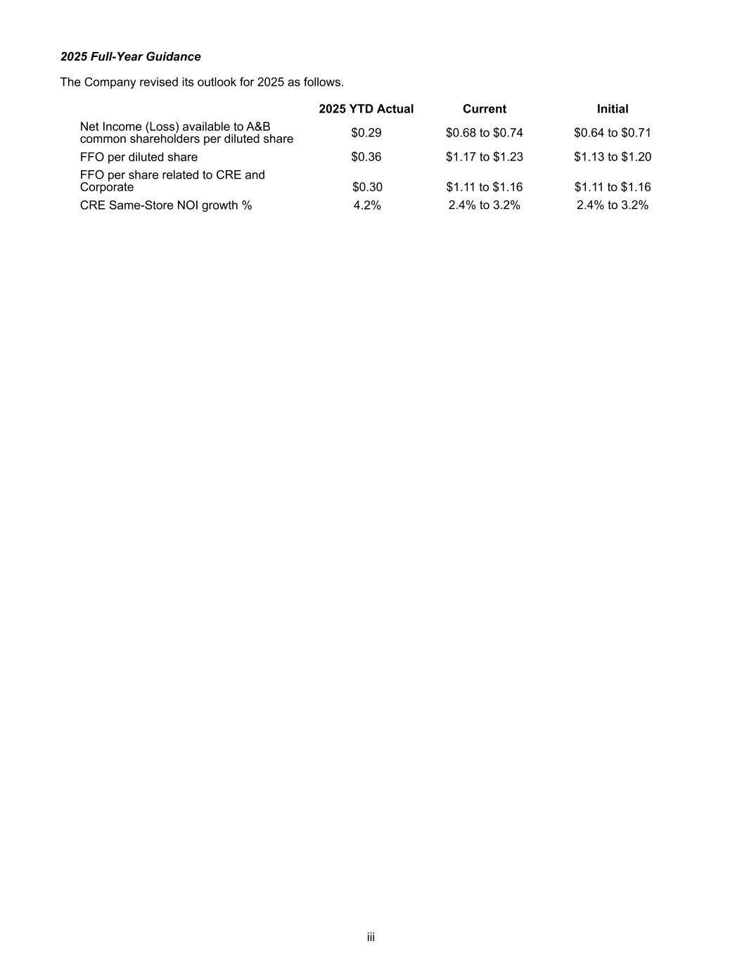 2025年全年指引公司修订2025年展望如下。A & B普通股股东可获得的每股摊薄收益(亏损)0.29美元0.68美元至0.74美元0.64美元至0.71美元FFO每股摊薄收益0.36美元1.17美元至1.23美元1.13美元至1.20美元与CRE和企业相关的每股FFO 0.30美元1.11美元至1.16美元1.11美元至1.16美元CRE同店NOI增长% 4.2% 2.4%至3.2% 2.4%至3.2% 2025年初至今实际当前初始iii
