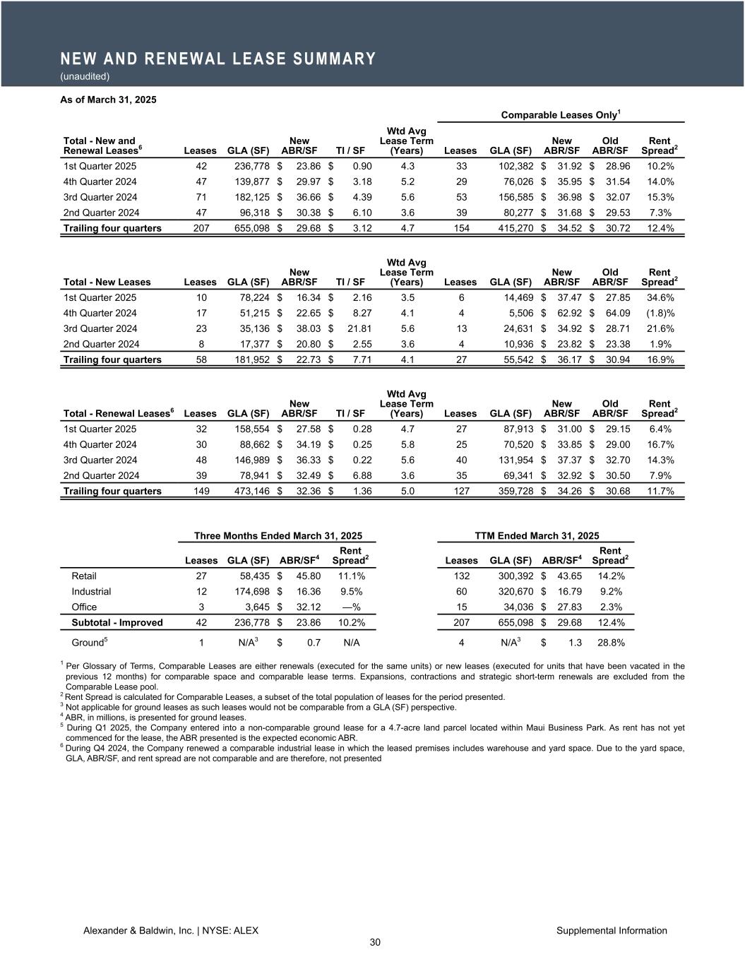 截至3月31日的新租及续租租约概要(未经审核),2025年仅可比租赁1合计-新and Renewal Leases6 Leases GLA(SF)New ABR/SF TI/SF WTD Avg Lease Term(Years)Leases GLA(SF)New ABR/SF Old ABR/SF Rent Spread2 Q1 Quarter 202542236,778 $ 23.86 $ 0.90 4.33 3102,382 $ 31.92 $ 28.96 10.2% 4th Quarter 202447139,877 $ 29.97 $ 3.185.22 976,026 $ 35.95 $ 31.54 14.0% 3rd quarter 202471182,125 $ 36.66 $ 4.395.65 3156,585 $ 36.98 $ 32.07 15.3% 2nd quarter 20244796,318 $ 30.38 $ 6.10 3.63980,277 $$ 3.12 4.7154415,270 $ 34.52 $ 30.72 12.4% total-new leases leases GLA(SF)new ABR/SF TI/SF WTD avg lease term(years)leases GLA(SF)new ABR/SF old ABR/SF rent spread2 Q1 quarter 20251078,224 $ 16.34 $ 2.16 3.56 14,469 $ 37.47 $ 27.85 34.6% 4th quarter 20241751,215 $ 22.65 $ 8.27 4.145,506 $ 62.92 $ 62.92 $ 64.09(1.8)% 3rd quarter 20242335,136 $ 38.03 $ 21.81 5.6 1324,631 $ 34.92 $ 28.71 21.6% 2nd quarter$ 23.82 $ 23.38 1.9% trailing four quarters 58 181,952 $ 22.73 $ 7.71 4.12755,542 $ 36.17 $ 30.94 16.9% total-renewal leases6 leases GLA(SF)new ABR/SF TI/SF WTD avg lease term(years)leases GLA(SF)new ABR/SF old ABR/SF rent spread2 Q1 quarter 202532 158,554 $ 27.58 $ 0.28 4.7 2787,913 $ 31.00 $ 29.156.4% 4th quarter 20243088,662 $ 34.19 $ 0.255.8 2570,520 $ 33.85 $ 29.00 16.7% 3rd quarter 202448146,989 $ 36.33 $2024年第二季度3978,941美元32.49美元6.88 3.63569,341美元32.92美元30.507.9%过去四个季度149473,146美元32.36美元1.365.0 127359,728美元34.26美元30.68美元11.7%截至2025年3月31日的三个月TTM截至2025年3月31日的三个月,2025 Leases GLA(SF)ABR/SF4 Rent Spread2 Leases GLA(SF)ABR/SF4 Rent Spread2 Retail 2758,435 $ 45.80 11.1% 132300,392 $ 43.65 14.2% Industrial 12174,698 $ 16.36 9.5% 60320,670 $ 16.7 99.2% Office 33,645 $ 32.12 —% 1534,036 $ 27.83 2.3%小计-改善42236,778 $ 23.86 10.2% 207655,098 $ 29.68 12.4% Ground5 1 N/A3 $ 0.7 N/A4 N/A3 $ 1.328.8% 1每个术语表,可比租赁要么是续租(针对相同单元执行),要么是新租赁(针对过去12个月内已腾出的单元执行),用于可比空间和可比租赁条款。可比租赁池中不包括扩张、收缩和战略性短期续租。2租金价差是为可比租赁计算的,该租赁是所示期间租赁总数的子集。3不适用于地面租赁,因为从GLA(SF)的角度来看,此类租赁无法进行比较。4 ABR,单位:百万,用于地面租赁。5在2025年第一季度,公司就位于毛伊岛商业园内的一块4.7英亩的地块签订了不可比较的土地租约。由于租赁尚未开始租金,所提出的ABR为预期的经济ABR。6在2024年第四季度,公司续签了一份可比的工业租赁,其中租赁的房地包括仓库和堆场空间。由于院子空间的原因,GLA、ABR/SF和租金价差不具有可比性,因此,未呈现Alexander & Baldwin, Inc. | NYSE:ALEX补充信息30