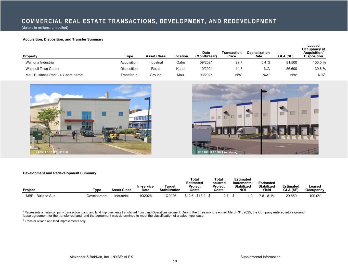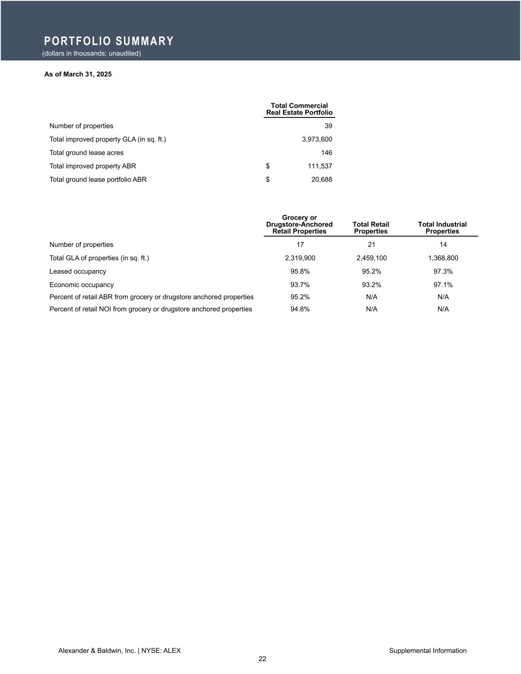 改善的财产报告(千美元,除每平方英尺数据外;未经审计)Industrial:1 Komohana Industrial Park Oahu 238,30093.1% 93.2% $ 3,593 $ 16.18 $ 1,3985.0% 2 Kaka ` ako Commerce Center Oahu 201,10095.6% 93.9% 2,59213.79 5131.8% 3 Waipio Industrial Oahu 158,40098.6% 98.6% 2,94018.83 7362.6% 4 Opule Industrial Oahu 151,500100.0% 100.0% 2,78718.403951.4% 5 P & L Warehouse Maui 104,10098.1% 98.1% 1,70516.694151.5% 6 Kapolei Enterprise Center Oahu 93,100100.0% 100.0% 1,696 18.23 4181.5% 7 Honokohau Industrial夏威夷岛86,700100.0% 100.0% 1,45116.73 3661.3% 8 Waihona Industrial2 Oahu 81,500100.0% 100.0% 1,588 19.49 3961.4% 9 Kailua Industrial/Other Oahu 68,90097.1% 97.1% 1,27919.12 2550.9% 10 Port Allen Center Kauai 64,600100.0% 100.0% 86413.38 2650.9% 11 Harbor Industrial2 Maui 51,10090.6% 90.6% 66614.39 1360.5% 12 Kaomi Loop Industrial Oahu 33,200100.0% 100.0% 54316.34 1370.5% 13 KAhai Street Industrial Oahu 27,900100.0% 100.0% 43515.60 1090.4% 14毛伊拉尼工业毛伊8,400100.0% 100.0% 16019.05 410.1%小计–工业1,368,80097.3% 97.1% $ 22,299 $ 16.79 $ 5,58019.8%办公室:1 Kahului办公楼2毛伊岛59,10068.7% 60.6% $ 1,143 $ 31.96 $ 2300.8% 2 Gateway at Mililani Mauka South Oahu 37,100100.0% 100.0% 1,87550.48 4671.7% 3 Kahului办公中心毛伊岛35,80092.2% 92.2% 1,08032.73 3071.1% 4 Lono Center2毛伊岛13,70037.2% 37.2% 12932.23(24)(0.1)%小计– Office 145,70079.5% 76.2% $ 4,227 $ 38.46 $ 9803.5% 39 Total – Improved Portfolio 3,973,60095.4% 93.9% $ 111,537 $ 30.16 $ 28,193100.0% 1 Shadow-anchor tenant 2 Property is currently not included in the Same-Store pool。Property Island Current GLA(SF)Leased/Economic Occupancy ABR ABR PSF Q1 2025 NOI Q1 2025% NOI to Improved Portfolio NOI Alexander & Baldwin, Inc. | NYSE:ALEX补充信息26