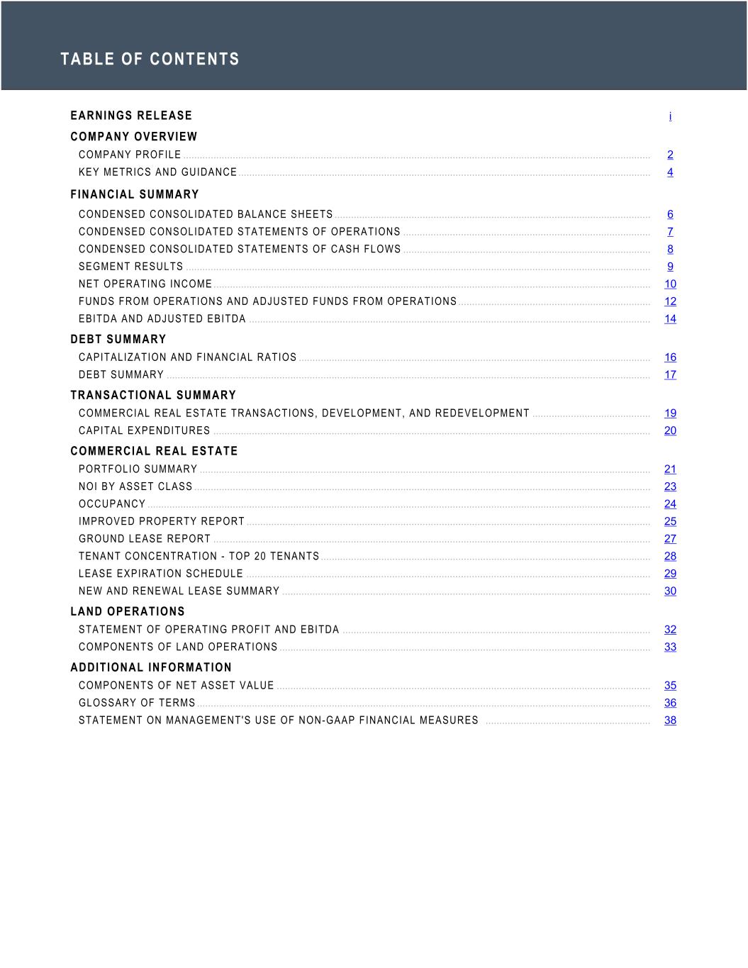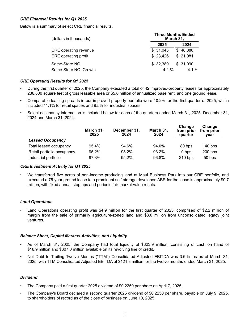 CRE 2025年第一季度财务业绩以下是精选CRE财务业绩摘要。(单位:千美元)截至2025年3月31日的三个月2024年CRE营业收入51,043美元48,888美元CRE营业利润23,426美元21,981美元同店NOI 32,389美元31,090美元同店NOI增长4.2% 4.1% CRE 2025年第一季度经营业绩•在2025年第一季度,公司共执行了42项改善物业租赁,总可出租面积约为236,800平方英尺或年化基本租金为560万美元,以及一项地面租赁。• 2025年第一季度,我们改善后物业组合的可比租赁利差为10.2%,其中零售空间为11.1%,工业空间为9.5%。•以下包括截至2025年3月31日、2024年12月31日和2024年3月31日的每个季度的选定占用信息。2025年3月31日2024年12月31日2024年3月31日与上一季度相比的变化租赁入住率总租赁入住率95.4% 94.6% 94.0% 80个基点140个基点零售投资组合入住率95.2% 95.2% 93.2% 0个基点200个基点工业投资组合入住率97.3% 95.2% 96.8% 210个基点50个基点2025年第一季度CRE投资活动•我们将毛伊岛商业园的5英亩非创收土地转入我们的CRE投资组合,并向一家知名的自助仓储开发商执行了75年的地面租赁。租赁的ABR约为70万美元,每年有固定的涨幅和定期的公平市场价值重置。Land Operations • Land Operations 2025年第一季度的运营利润为490万美元,其中包括出售主要是农业区土地的220万美元保证金和未合并的传统合资企业的300万美元保证金。资产负债表、资本市场活动和流动性•截至2025年3月31日,公司的流动资金总额为3.239亿美元,其中包括1690万美元的手头现金和循环信贷额度可用的3.070亿美元。•截至2025年3月31日,截至2025年3月31日的12个月净债务至过去12个月(“TTM”)合并调整后EBITDA为3.6倍,截至2025年3月31日的12个月,TTM合并调整后EBITDA为1.213亿美元。股息•公司于2025年4月7日支付2025年第一季度股息每股0.2250美元。•公司董事会宣布2025年第二季度股息为每股0.2250美元,将于2025年7月9日支付给截至2025年6月13日营业结束时登记在册的股东。ii