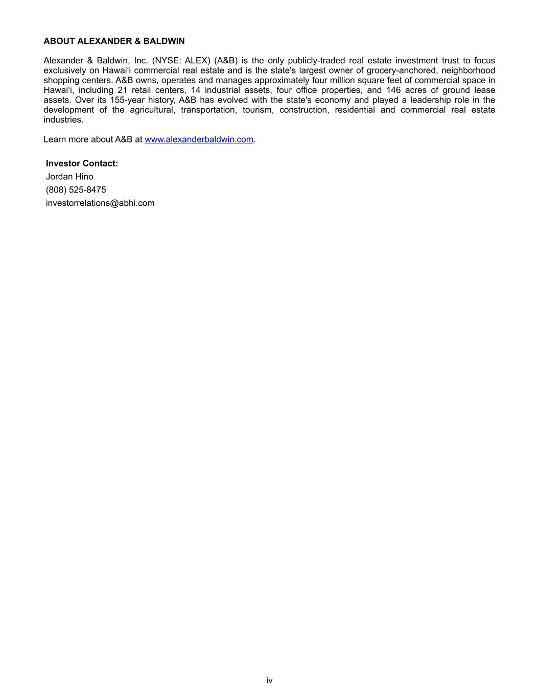 关于亚历山大和鲍德温Alexander & Baldwin, Inc.(NYSE:ALEX)(A & B)是唯一一家专注于夏威夷商业地产的公开交易房地产投资信托基金,也是该州最大的以杂货为基础的邻里购物中心所有者。A & B在夏威夷拥有、运营和管理约400万平方英尺的商业空间,其中包括21个零售中心、14个工业资产、四个办公物业以及146英亩的地面租赁资产。A & B在其155年的历史中,随着该州的经济发展而发展,并在农业、交通、旅游、建筑、住宅和商业房地产行业的发展中发挥了领导作用。了解有关A & B的更多信息,请访问www.alexanderbaldwin.com。投资者联系人:Jordan Hino(808)525-8475investorrelations@abhi.com四
