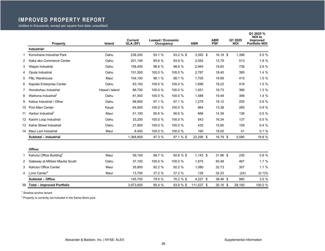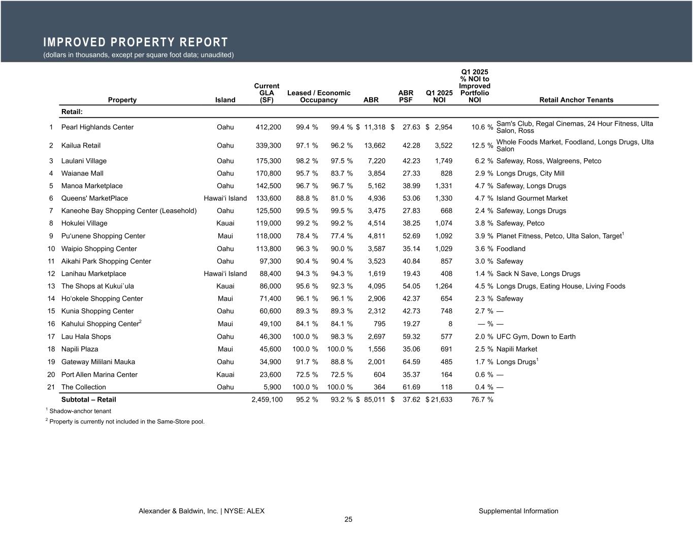 改进的财产报告(以千美元计,每平方英尺数据除外;未经审计)零售:1 Pearl Highlands Center Oahu 412,20099.4% 99.4% $ 11,318 $ 27.63 $ 2,95410.6% Sam's Club,Regal Cinemas,24 Hour Fitness,Ulta Salon,Ross 2 Kailua Retail Oahu 339,30097.1% 96.2% 13,66242.283,52212.5% 全食超市,Foodland,Longs Drugs,Ulta Salon 3 Laurani Village Oahu 175,30098.2% 97.5% 7,22042.231,7496.2% Safeway,Ross,Walgreens,Petco 4 Waianae Mall Oahu 170,80095.7% 83.7% 3,85427.338282.9% Longs Drugs,City Mill 5 Manoa MarketPlace Oahu 142,50096.7% 96.7% 5,16238.991,3314.7% Safeway,Longs Drugs 6 Queens‘MarketPlace Hawai’i Island 133,60088.8% 81.0% 4,93653.061,3304.7% Island Gourmet Market 7 Kaneohe Bay Shopping Center(leasehold)Oahu 125,50099.5% 99.5% 3,47527.83 668 2.4% Safeway,Longs Drugs 8 Hokulei Village Kauai 119,00099.2% 99.2% 4,51438.251,0743.8% Safeway,Petco 9 Pu'unene Shopping Center Maui 118,00078.4% 77.4% 4,81152.691,0923.9% 星球健身,Petco,Ulta SalTarget110 Waipio购物中心Oahu 113,80096.3% 90.0% 3,58735.14 1,0293.6% Foodland 11 Aikahi Park购物中心Oahu 97,30090.4% 90.4% 3,52340.848573.0% Safeway 12 Lanihau Marketplace Hawai‘i Island 88,40094.3% 94.3% 1,61919.43 4081.4% Sack N Save,Longs Drugs 13 The Shops at Kukui ` ula Kauai 86,00095.6% 92.3% 4,09554.051,2644.5% Longs Drugs,Eating House,Living Foods 14 Ho‘okele购物中心毛伊岛71,40096.1% 96.1% 2,90642.376542.3% Safeway 15 Kunia购物中心瓦胡岛60,60089.3% 89.3% 2,31242.73 7482.7% — 16 Kahului购物中心2毛伊岛49,10084.1% 84.1% 79519.278 —% — 17 Lau Hala Shops Oahu 46,300100.0% 98.3% 2,69759.325772.0% UFC健身房,Down to Earth 18 Napili Plaza Maui 45,600100.0% 100.0% 1,55635.066912.5% Napili Market 19 Gateway Mililani Mauka Oahu 34,90091.7% 88.8% 2,00164.594851.7% Longs Drugs120 Port Allen Marina Center Kauai 23,60072.5% 72.5% 60435.37 1640.6% — 21 The Collection Oahu 5,900100.0% 100.0% 36461.69 1180.4% —小计–零售2,459,10095.2% 93.2% $ 85,011 $ 37.62 $ 21,63376.7% 1 Shadow-anchor tenant 2 Property is currently not included in the Same-Store Pool。Property Island当前GLA(SF)租赁/经济占用ABR ABR PSF 2025年第一季度NOI 2025年第一季度NOI % NOI以改善投资组合NOI零售锚定租户Alexander & Baldwin, Inc. | NYSE:ALEX补充信息25