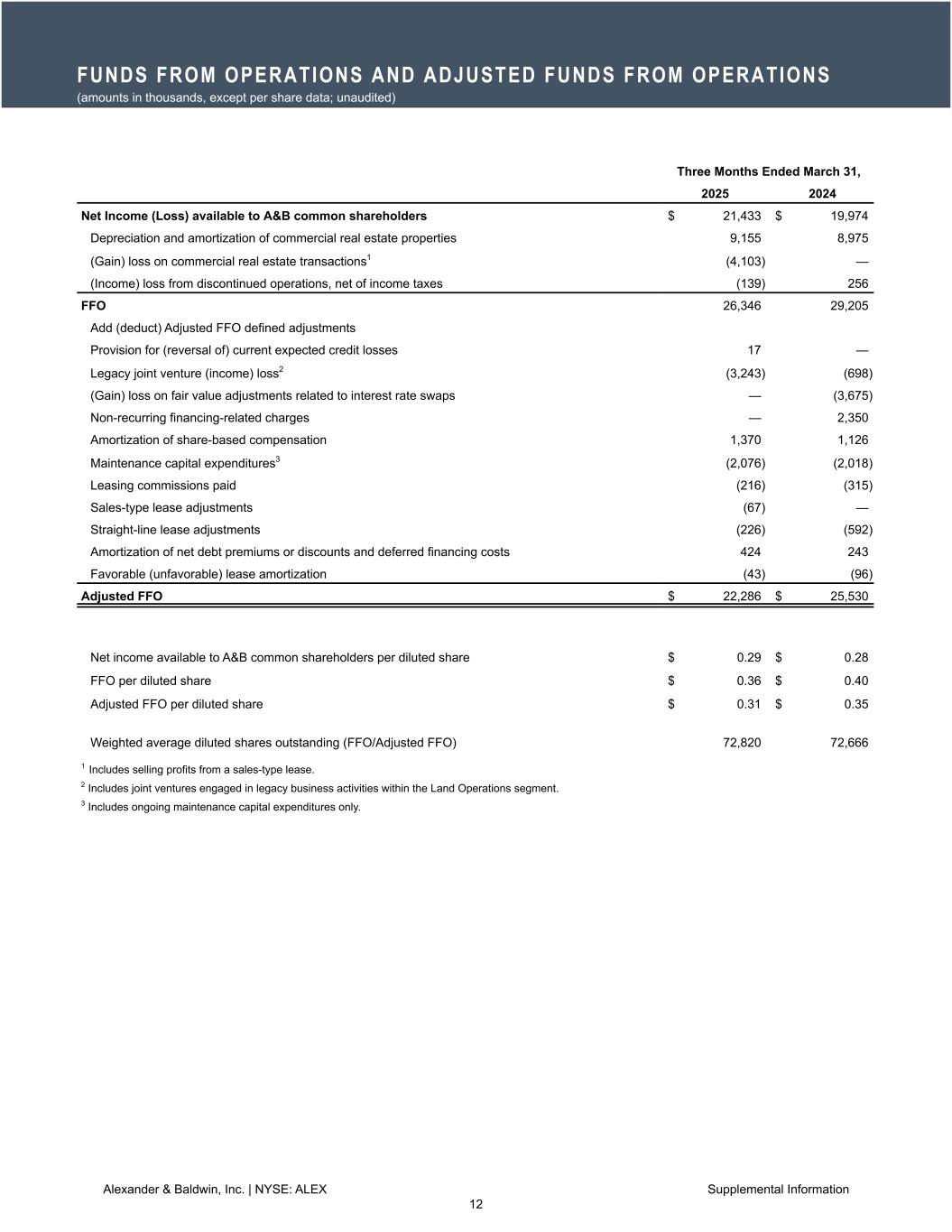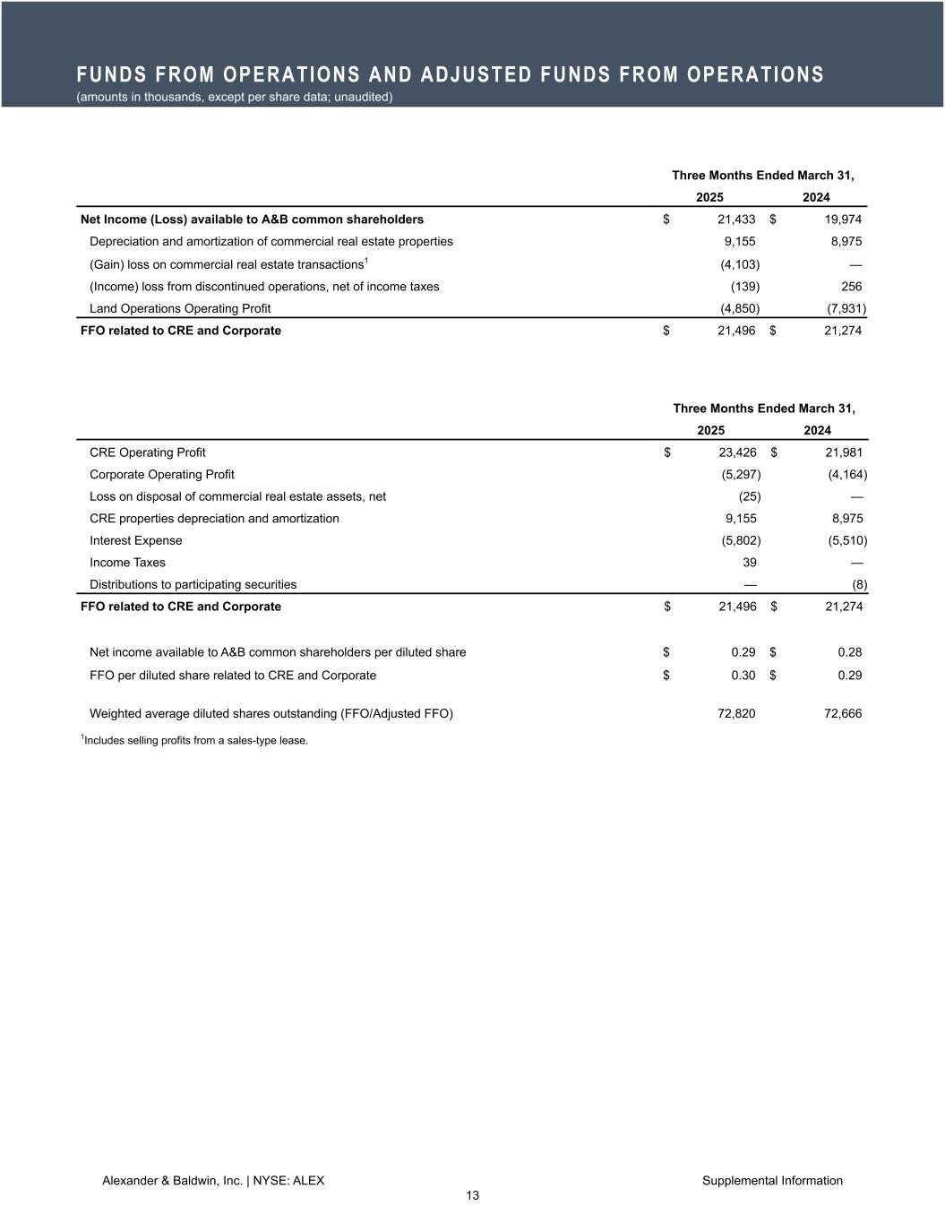 来自运营的资金和来自运营的调整后资金(以千为单位,每股数据除外;未经审计)截至2025年3月31日的三个月2024年A & B普通股股东可获得的净收入(亏损)21,433美元19,974美元商业房地产物业折旧和摊销9,1558,975(收益)商业房地产交易损失1(4,103)——(收入)终止经营损失,扣除所得税(139)256 FFO 26,34629,205加(减)调整后FFO界定调整当期预期信用损失准备(转回)17 —遗留合营企业(收入)损失2(3,243)(698)(收益)与利率掉期相关的公允价值调整损失—(3,675)与非经常性融资相关的费用— 2,350以股份为基础的补偿摊销1,3701,126维持资本支出3(2,076)(2,018)支付的租赁佣金(216)(315)销售型租赁调整(67)—直线租赁调整(226)(592)净债务溢价或折价的摊销和递延融资成本424243有利(不利)租赁摊销(43)(96)调整后FFO 22,286美元25,530美元A & B普通股股东每股摊薄收益0.29美元0.28美元FFO每股摊薄收益0.36美元0.40美元调整后FFO每股摊薄收益0.31美元0.35美元加权平均摊薄流通股(FFO/调整后FFO)72,82072,6661包括销售型租赁的销售利润。2包括在土地运营部门内从事遗留业务活动的合资企业。3仅包括持续维护资本支出。Alexander & Baldwin, Inc. | NYSE:ALEX补充信息12