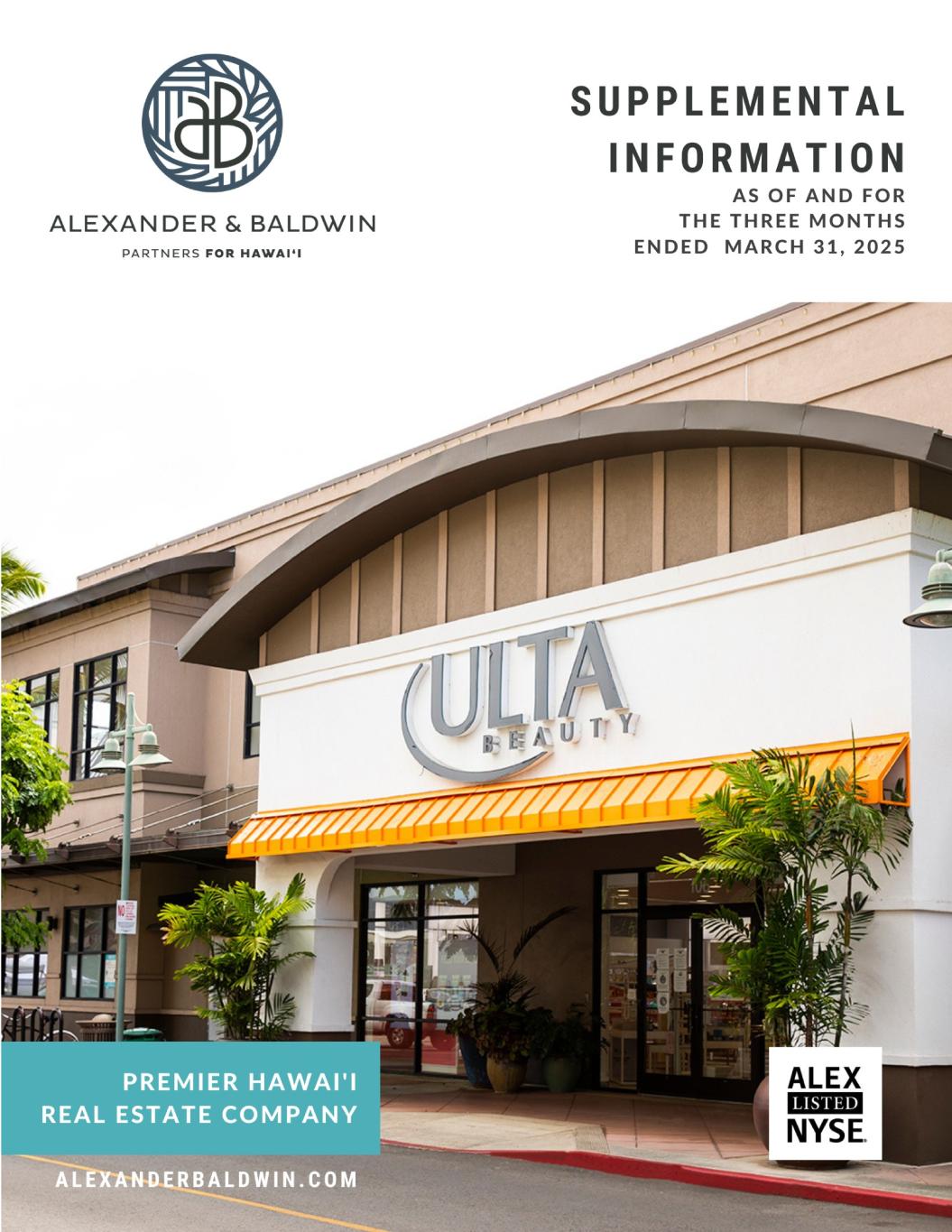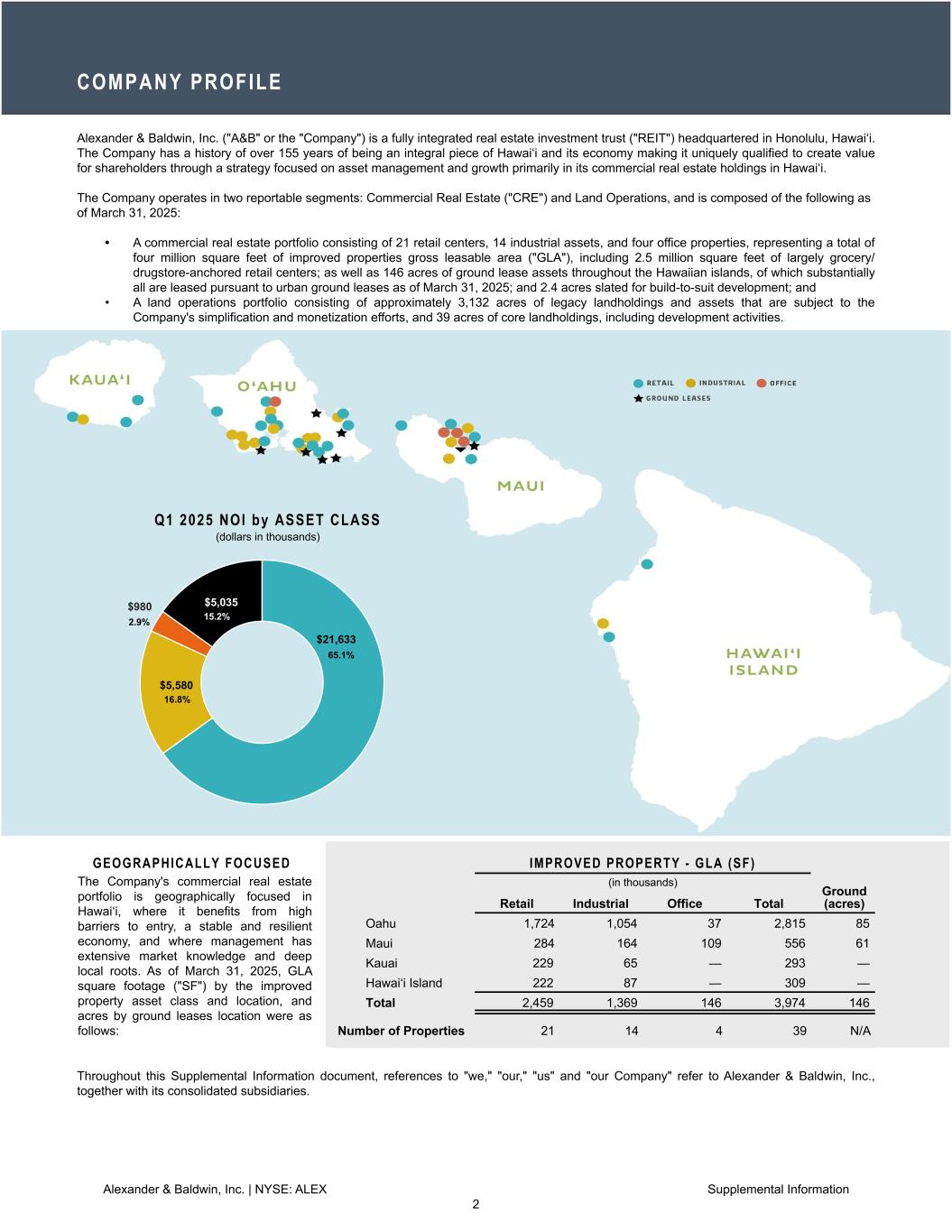 公司简介Alexander & Baldwin, Inc.(“A & B”或“公司”)是一家完全整合的房地产投资信托基金(“REIT”),总部位于夏威夷火奴鲁鲁。该公司已有超过155年的历史,是夏威夷及其经济的组成部分,这使其具有独特的资格,可以通过主要专注于其在夏威夷持有的商业房地产的资产管理和增长的战略为股东创造价值。该公司经营两个可报告分部:商业房地产(“CRE”)和土地业务,截至2025年3月31日由以下部分组成:•商业房地产投资组合,包括21个零售中心、14个工业资产和四个办公物业,代表总计400万平方英尺的改善后物业总可出租面积(“GLA”),其中包括250万平方英尺的主要由杂货店/药店锚定的零售中心;以及遍布夏威夷群岛的146英亩土地租赁资产,截至3月31日,其中基本上全部根据城市土地租赁出租,2025年;和2.4英亩计划用于定制开发;•土地运营组合,包括约3,132英亩受公司简化和货币化努力影响的遗留土地所有权和资产,以及39英亩的核心土地所有权,包括开发活动。以地理位置为重点的改良物业-GLA(SF)(单位:千)地(英亩)零售工业办公室总计Oahu 1,7241,054372,81585 Maui 28416410955661 Kauai 22965 — 293 — Hawai‘i Island 22287 — 309 —总计2,4591,3691463,974146物业数量2114439 N/A在本补充信息文件中,提及的“我们”、“我们的”、“我们”和“我们的公司”是指Alexander & Baldwin, Inc.及其合并子公司。Alexander & Baldwin, Inc. | NYSE:ALEX Supplemental Information 2 $ 21,633 $ 5,580 $ 980 $ 5,035该公司的商业房地产投资组合地理位置集中在夏威夷,该地区受益于高准入门槛、稳定和有韧性的经济,并且该地区的管理层拥有广泛的市场知识和深厚的当地根基。截至2025年3月31日,GLA平方英尺(“SF”)按改善后的物业资产类别和位置、按地面租赁位置划分的英亩面积如下:2.9% 2025年第一季度按资产类别划分的NOI(千美元)16.8% 15.2% 65.1%
