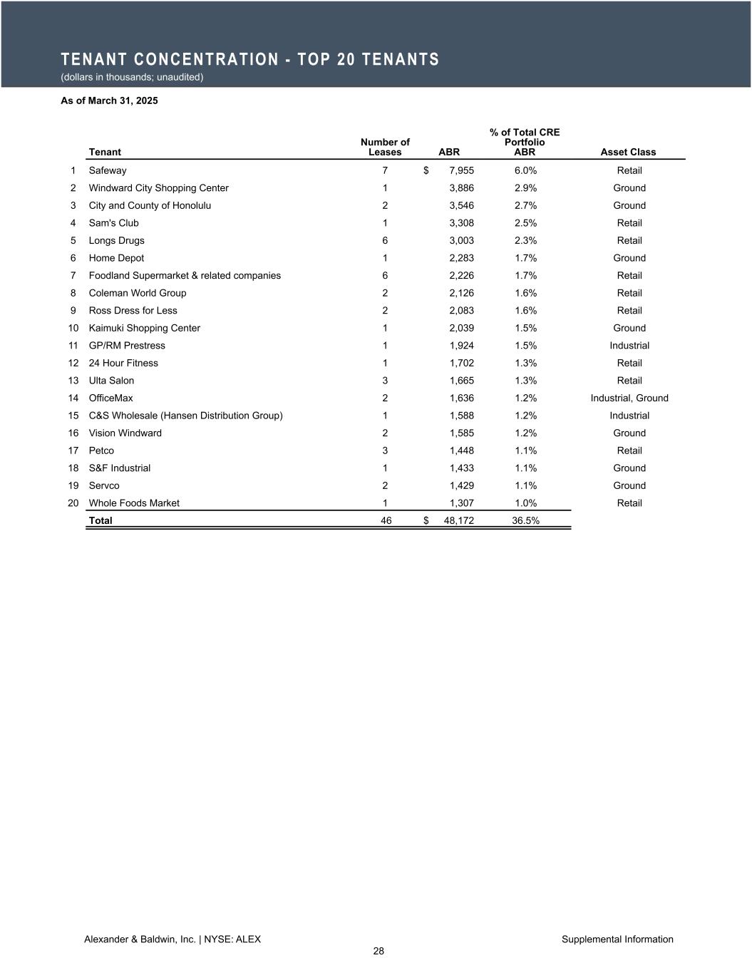 租户集中-TOP20租户(千美元;未经审计)截至3月31日,2025年租户租赁数量ABR占CRE投资组合总额的百分比ABR资产类别1 Safeway 7 $ 7,9556.0% Retail 2 Windward City Shopping Centre 13,8862.9% Ground 3 City和檀香山郡23,5462.7% Ground 4 Sam's Club 13,3082.5% Retail 5 Longs Drugs 63,0032.3% Retail 6 Home Depot 12,2831.7% Ground 7 Foodland Supermarket & related companies 62,2261.7% Retail 8 Coleman World Group 22,1261.6% Retail 9 Ross Dress for less 22,0831.6% Retail 10 Kaimuki Shopping Center 12,0391.5% Ground 11 GP/RM Prestress 11,9241.5% Industrial 12 24 Hour Fitness 11,7021.3% Retail 13 Ulta Salon 31,6651.3% Retail 14 OfficeMax 21,6361.2% Industrial,Ground 15 C & S Wholesale(Hansen Distribution Group)11,5881.2% Industrial 16 Vision Windward 21,5851.2% Ground 17 Petco 31,4481.1% Retail 18 S & F Industrial 11,4331.1% Ground 19 Servco 21,4291.1% Ground 20 全食超市 11,3071.0% Retail total 46 $ 48,17236.5% Alexander & Baldwin, Inc. | NYSE:ALEX补充信息28