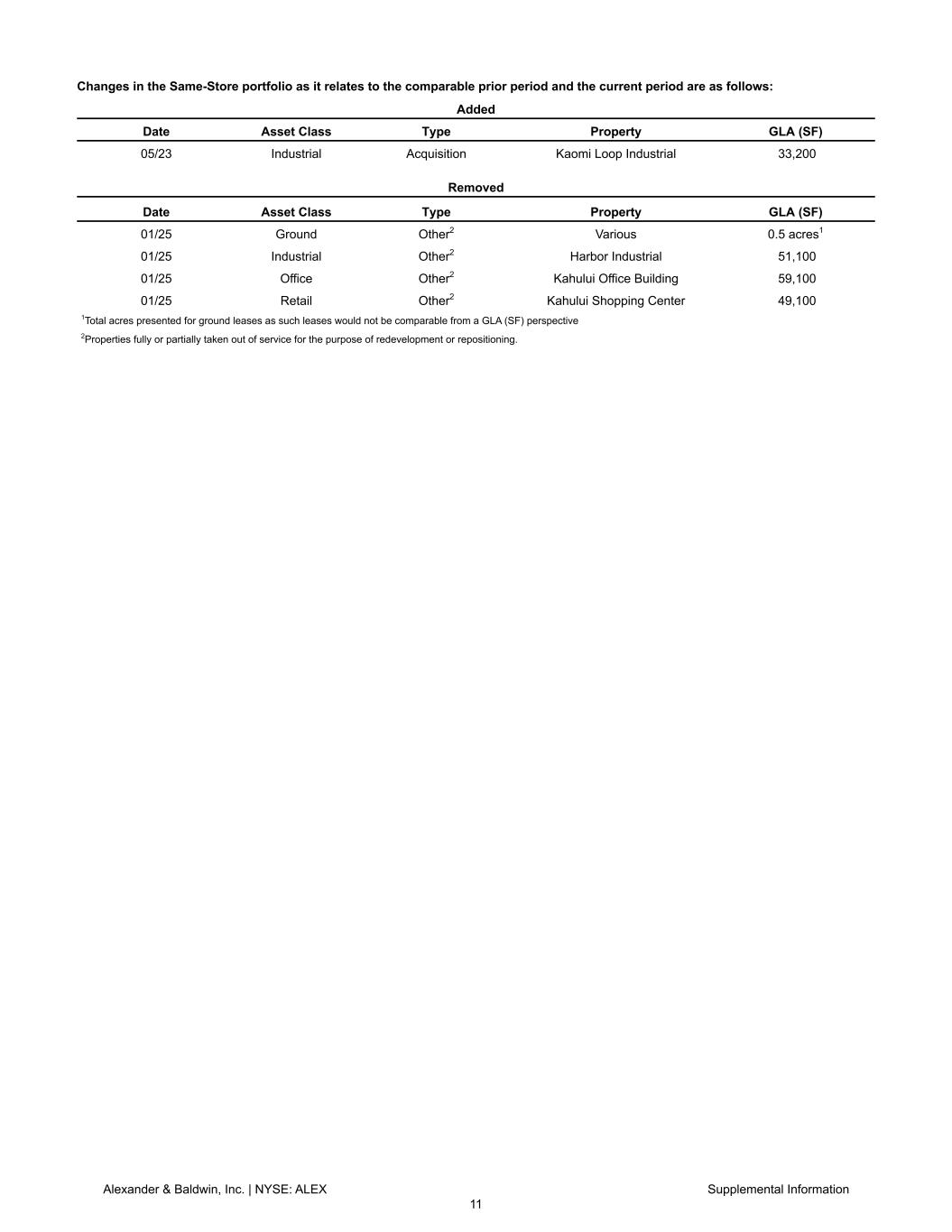 与可比上一期间相关的同店投资组合变化和本期如下:新增日期资产类别类型物业GLA(SF)05/23工业收购Kaomi Loop Industrial 33,200移除日期资产类别类型物业GLA(SF)01/25地Other2各种0.5英亩101/25工业Other2 Harbor Industrial 51,1001/25 Office Other2 Kahului办公楼59,1001/25 Retail Other2 Kahului购物中心49,1001作为土地租赁呈报的总英亩,因为从GLA(SF)的角度来看,这些租赁将无法比较2为重新开发或重新定位而全部或部分停止服务的物业。Alexander & Baldwin, Inc. | NYSE:ALEX补充信息11