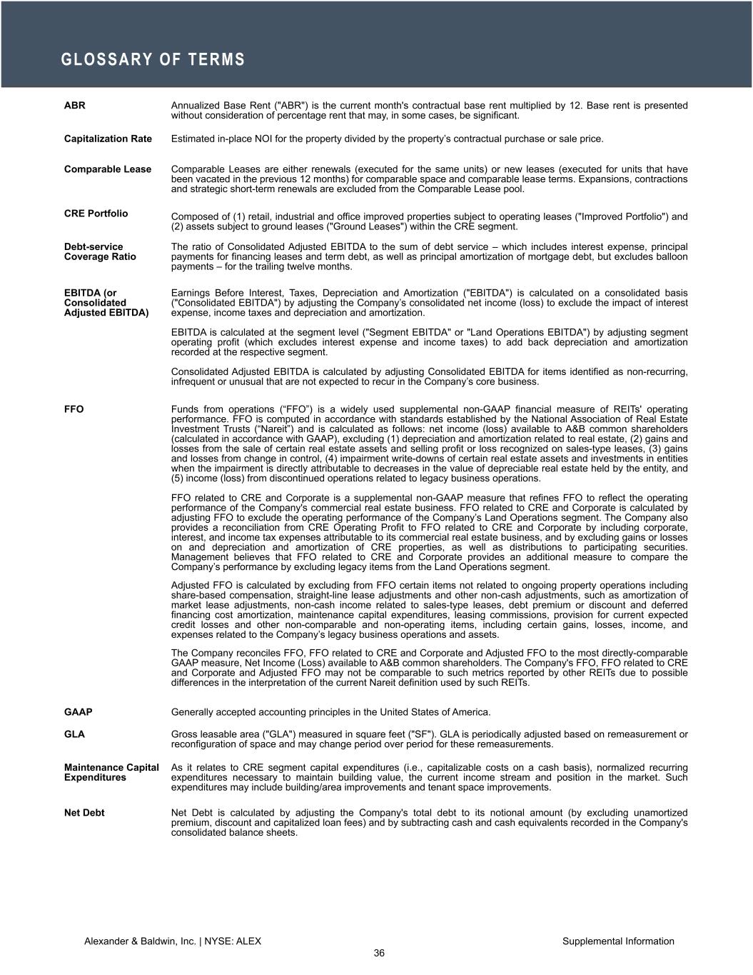 期限汇总表ABR年化基本租金(“ABR”)为当月合同基本租金乘以12。基本租金的列报没有考虑在某些情况下可能很重要的百分比租金。资本化率物业的估计到位NOI除以物业的合同购买或销售价格。可比租赁可比租赁是续租(针对相同单元执行)或新租赁(针对过去12个月内已腾出的单元执行),用于可比空间和可比租赁条款。可比租赁池中不包括扩张、收缩和战略性短期续租。CRE投资组合由CRE分部内的(1)受经营租赁约束的零售、工业和办公改善物业(“改善投资组合”)和(2)受地面租赁约束的资产(“地面租赁”)组成。偿债覆盖率合并调整后EBITDA与偿债总额的比率——包括利息支出、融资租赁和定期债务的本金支付,以及抵押债务的本金摊销,但不包括气球付款——在过去12个月。EBITDA(或合并调整后EBITDA)利息、税项、折旧及摊销前利润(“EBITDA”)是通过调整公司的合并净收益(亏损)以排除利息费用、所得税和折旧及摊销的影响,在合并基础上计算得出的(“合并EBITDA”)。EBITDA是在分部层面(“分部EBITDA”或“土地运营EBITDA”)计算的,方法是调整分部营业利润(不包括利息费用和所得税),以加回在相应分部记录的折旧和摊销。合并调整后EBITDA的计算方法是对公司核心业务中预计不会再次发生的被确定为非经常性、不经常或不寻常项目的合并EBITDA进行调整。FFO运营资金(简称“FFO”)是一种广泛使用的REITs经营业绩的补充性非GAAP财务指标。FFO根据美国房地产投资信托协会(“Nareit”)制定的标准计算,计算如下:A & B普通股股东可获得的净收入(亏损)(按照公认会计原则计算),不包括(1)与房地产相关的折旧和摊销,(2)出售某些房地产资产的损益和销售类租赁确认的销售损益,(3)控制权变更的损益,(4)当减值直接归因于实体持有的可折旧房地产价值下降时,对实体的某些房地产资产和投资进行减值减记,以及(5)与遗留业务运营相关的终止经营收入(损失)。与CRE和Corporate相关的FFO是一种补充性的非GAAP衡量标准,它对FFO进行了细化,以反映公司商业地产业务的经营业绩。与CRE和企业相关的FFO是通过调整FFO来计算的,以排除公司土地运营部门的经营业绩。该公司还提供了CRE营业利润与与CRE和公司相关的FFO的对账,方法是计入归属于其商业房地产业务的公司、利息和所得税费用,并排除CRE财产的损益、折旧和摊销,以及对参与证券的分配。管理层认为,与CRE和Corporate相关的FFO通过将遗留项目排除在土地运营部门之外,提供了一个额外的衡量标准来比较公司的业绩。调整后的FFO的计算方法是从FFO中排除与正在进行的物业运营无关的某些项目,包括以股份为基础的薪酬、直线租赁调整和其他非现金调整,例如市场租赁调整的摊销、与销售类租赁相关的非现金收入、债务溢价或折价和递延融资成本摊销、维护资本支出、租赁佣金、当期预期信用损失准备金和其他不可比和非经营性项目,包括与公司遗留业务运营和资产相关的某些收益、损失、收入和费用。该公司将FFO、与CRE和企业相关的FFO和调整后的FFO与最直接可比的GAAP衡量标准,即A & B普通股股东可获得的净收入(亏损)进行了核对。公司的FFO, 与CRE和公司相关的FFO以及调整后的FFO可能无法与其他REITs报告的此类指标进行比较,原因是此类REITs使用的当前Nareit定义的解释可能存在差异。美国公认会计准则公认会计原则。GLA可出租总面积(“GLA”),单位为平方英尺(“SF”)。GLA会根据空间的重新测量或重新配置进行定期调整,并且可能会因这些重新测量而改变周期。维持性资本支出,因为它与CRE部门资本支出(即以现金为基础的可资本化成本)、维持建筑价值所需的正常化经常性支出、当前收入流和市场地位有关。此类支出可能包括建筑/面积改善和租户空间改善。净负债净负债的计算方法是将公司的总债务调整至其名义金额(不包括未摊销的溢价、贴现和资本化的贷款费用),并减去公司合并资产负债表中记录的现金和现金等价物。Alexander & Baldwin, Inc. | NYSE:ALEX补充信息36