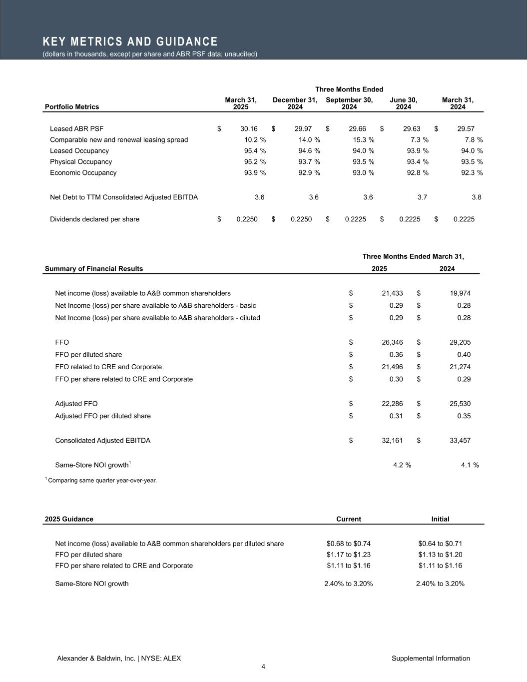 关键指标和指引(以千美元计,每股和ABR PSF数据除外;未经审计)三个月期末投资组合指标2025年3月31日2025年12月31日2024年9月30日2024年6月30日2024年3月31日,2024年租赁ABR PSF $ 30.16 $ 29.97 $ 29.66 $ 29.63 $ 29.57可比新建和续租租赁价差10.2% 14.0% 15.3% 7.3% 7.8%租赁占用率95.4% 94.6% 94.0% 93.9% 94.0% 94.0%实际占用率95.2% 93.7% 93.5% 93.4% 93.5%经济占用率93.9% 92.9% 93.0% 92.8% 92.3%净债务对TTM合并调整后EBITDA 3.6 3.6 3.6 3.7 3.8每股宣派股息$ 0.2250 $ 0.2250 $ 0.2225 $ 0.2225 $ 0.2225截至3月31日止三个月,财务业绩摘要20252024年A & B普通股股东可获得的净收入(亏损)21,433美元19,974美元A & B股东可获得的每股净收入(亏损)-基本0.29美元0.28美元A & B股东可获得的每股净收入(亏损)-稀释后0.29美元0.28美元FFO 26,346美元29,205美元FFO每股摊薄后0.36美元0.40美元与CRE和企业相关的FFO 21,496美元21,274美元与CRE相关的每股FFO企业0.30美元0.29美元调整后FFO 22,286美元25,530美元调整后FFO每股摊薄收益0.31美元0.35美元合并调整后EBITDA 32,161美元33,457美元同店NOI增长14.2% 4.1% 1同季度同比。2025指导当前A & B普通股股东可获得的每股摊薄后初始净收入(亏损)0.68美元至0.74美元0.64美元至0.71美元FFO每股摊薄后1.17美元至1.23美元1.13美元至1.20美元FFO与CRE和企业相关的每股FFO 1.11美元至1.16美元1.11美元至1.16美元同店NOI增长2.40%至3.20% 2.40%至3.20% Alexander & Baldwin, Inc. |纽约证券交易所:ALEX补充信息4