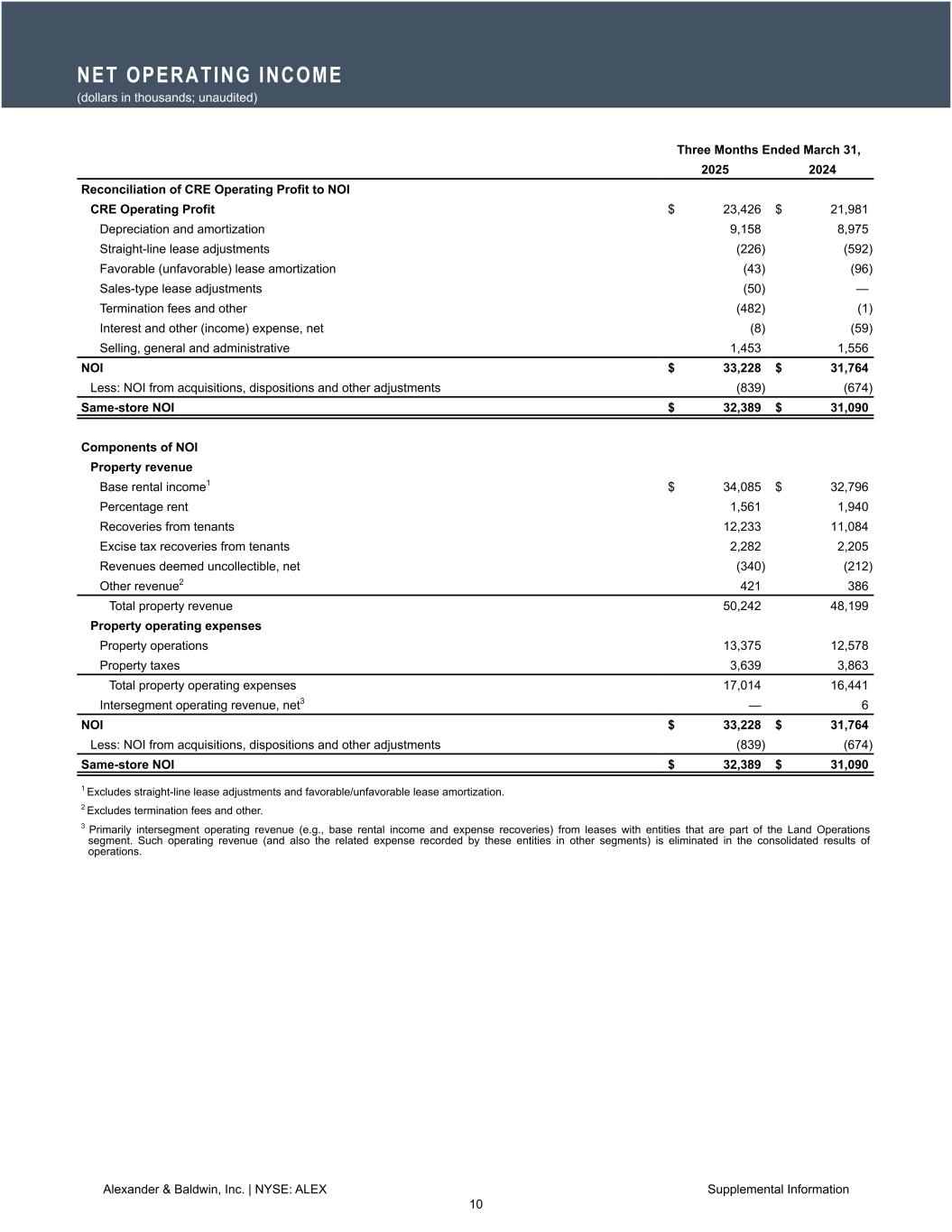 分部业绩(千美元;未经审计)截至2025年3月31日的三个月2024年分部营业收入商业地产1 $ 51,043 $ 48,894土地运营2,69512,314分部营业总收入53,73861,208营业利润(亏损):商业地产1 23,42621,981土地运营2 4,8507,931总营业利润(亏损)28,27629,912商业地产交易收益(亏损)4,103 —利息费用(5,802)(5,510)公司及其他费用(5,322)(4,164)所得税前持续经营收入(亏损)21,25520,238所得税收益(费用)39 —持续经营收入(亏损)21,29420,238终止经营收入(亏损),扣除所得税后139(256)净收入(亏损)21,433美元19,9821美元1商业房地产部门营业利润(亏损)包括主要来自土地运营部门的部门间营业收入,该收入在综合经营业绩中消除。2土地经营分部经营利润(亏损)包括来自商业地产分部的分部间经营费用,该费用在综合经营业绩中消除。Alexander & Baldwin, Inc. | NYSE:ALEX补充信息9