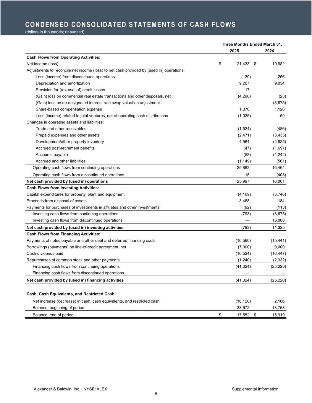 现金流量简明合并报表(单位:千美元;未经审计)截至2025年3月31日的三个月2024年经营活动现金流量:净收入(亏损)21,433美元19,982美元调整以调节净收入(亏损)与经营提供(用于)的净现金:终止经营的损失(收入)(139)256折旧和摊销9,2079,034信贷损失准备(转回)17 ——商业房地产交易和其他处置的(收益)损失,净额(4,296)(23)(收益)非指定利率掉期估值调整损失——(3,675)股份补偿费用1,3701,126与合营企业相关的损失(收益),经营现金分配净额(1,025)50经营资产和负债变动:贸易和其他应收款(1,524)(486)预付费用和其他资产(2,471)(3,435)开发/其他财产存货4,564(2,925)应计退休后福利(47)(1,697)应付账款(58)(1,242)应计和其他负债(1,149)(501)持续经营产生的经营现金流量25,88216,464终止经营产生的经营现金流量115(403)经营产生(用于)的现金净额25,99716,061投资活动产生的现金流量:财产资本支出,厂房及设备(4,169)(3,746)资产处置收益3,468 184购买附属公司投资及其他投资的款项(92)(113)投资持续经营现金流(793)(3,675)投资终止经营现金流— 15,000投资活动提供(用于)的现金净额(793)11,325融资活动产生的现金流量:支付应付票据及其他债务和递延融资费用(16,560)(15,441)信贷额度协议借款(付款),支付的现金净额(7,000)9000支付的现金股息(16,524)(16,447)回购普通股和其他付款(1,240)(2,332)来自持续经营业务的筹资现金流(41,324)(25,220)来自已终止经营业务的筹资现金流——筹资活动提供(用于)的现金净额(41,324)(25,220)现金、现金等价物和受限现金净增(减)额(16,120)2,166余额,期初33,67213,753余额,期末17,552美元15,919美元Alexander & Baldwin, Inc. |纽约证券交易所:ALEX补充信息8