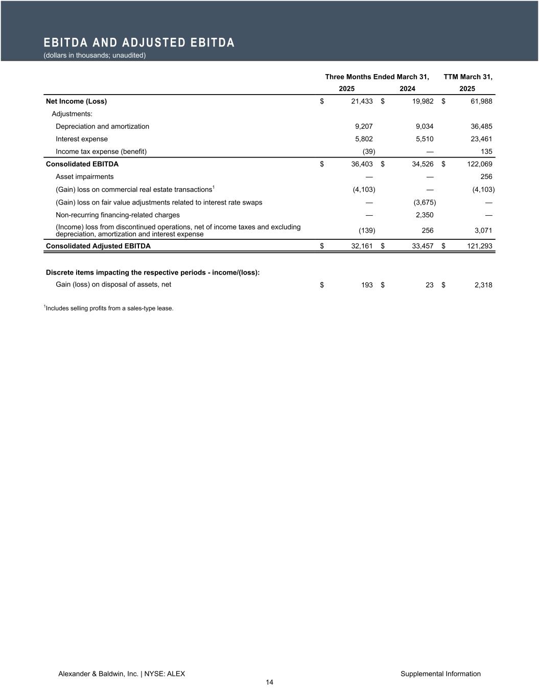 来自运营的资金和来自运营的调整后资金(以千为单位,每股数据除外;未经审计)截至2025年3月31日的三个月2024年A & B普通股股东可获得的净收入(亏损)21,433美元19,974美元商业房地产物业的折旧和摊销9,1558,975(收益)商业房地产交易损失1(4,103)—(收入)终止经营的损失,扣除所得税(139)256土地运营营业利润(4,850)(7,931)与CRE和公司相关的FFO 21,496美元21,274美元截至3月31日的三个月,20252024 CRE营业利润$ 23,426 $ 21,981企业营业利润(5,297)(4,164)商业房地产资产处置损失,净额(25)— CRE物业折旧和摊销9,1558,975利息费用(5,802)(5,510)所得税39 —分配给参与证券——(8)与CRE和企业相关的FFO $ 21,496 $ 21,274 A & B普通股股东可获得的每股摊薄收益$ 0.29 $ 0.28 FFO与CRE和企业相关的每股摊薄收益$ 0.30 $ 0.29加权平均摊薄流通股(FFO/调整后FFO)72,82072,661包括销售类租赁的销售利润。Alexander & Baldwin, Inc. | NYSE:ALEX补充资料13