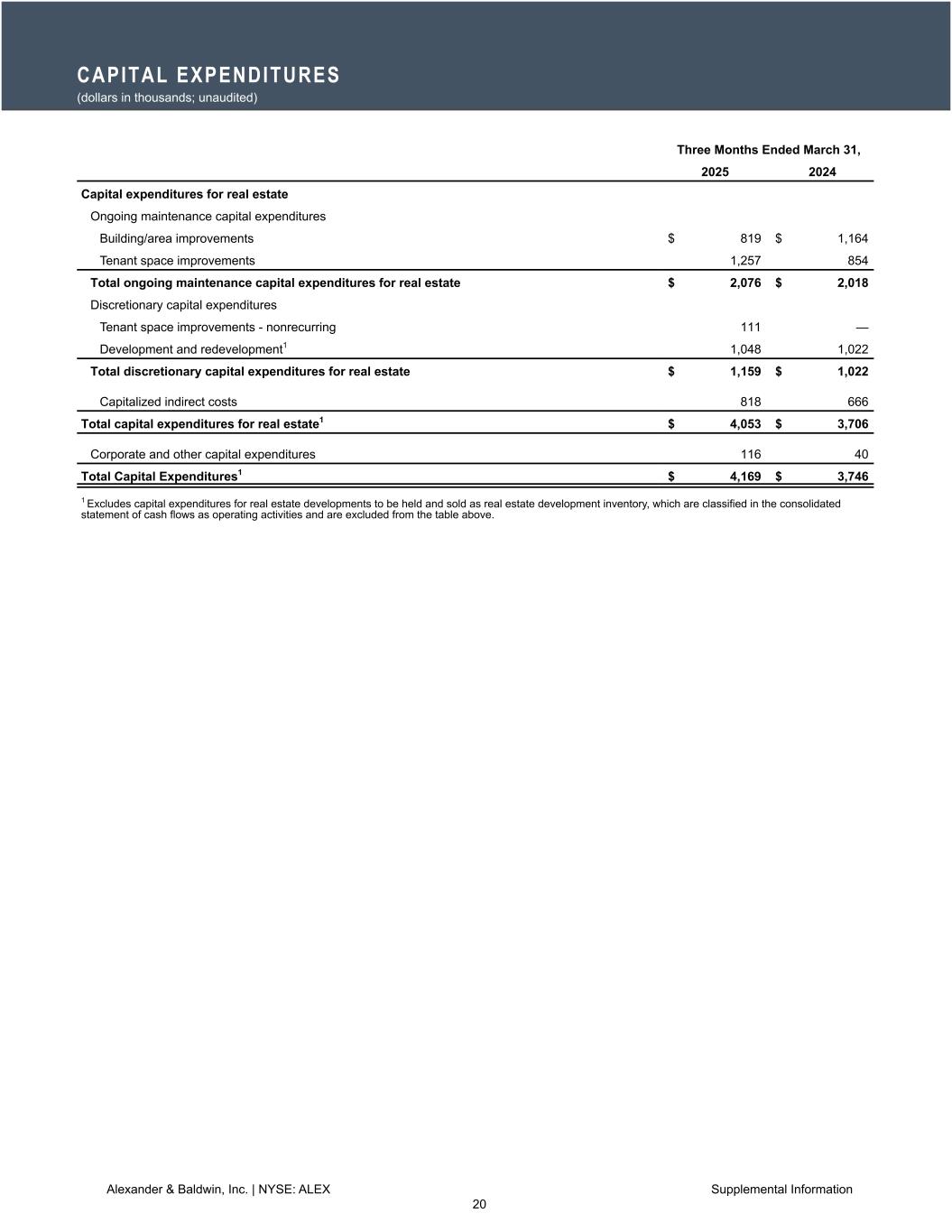 资本支出(千美元;未经审计)截至3月31日的三个月,20252024年房地产持续维护资本支出建筑/面积改善819美元1164美元租户空间改善1,257854房地产持续维护资本支出总额2,076美元2,018可自由支配资本支出租户空间改善-非经常性111 —开发和再开发1,0481,022房地产可自由支配资本支出总额1,159美元1,022资本化间接成本818666房地产资本支出总额1,053美元3,706公司和其他资本支出11640资本支出总额1美元4,169美元3,746美元1不包括作为房地产开发存货持有和出售的房地产开发的资本支出,这些资本支出在综合现金流量表中归类为经营活动,不包括在上表中。Alexander & Baldwin, Inc. | NYSE:ALEX补充信息20