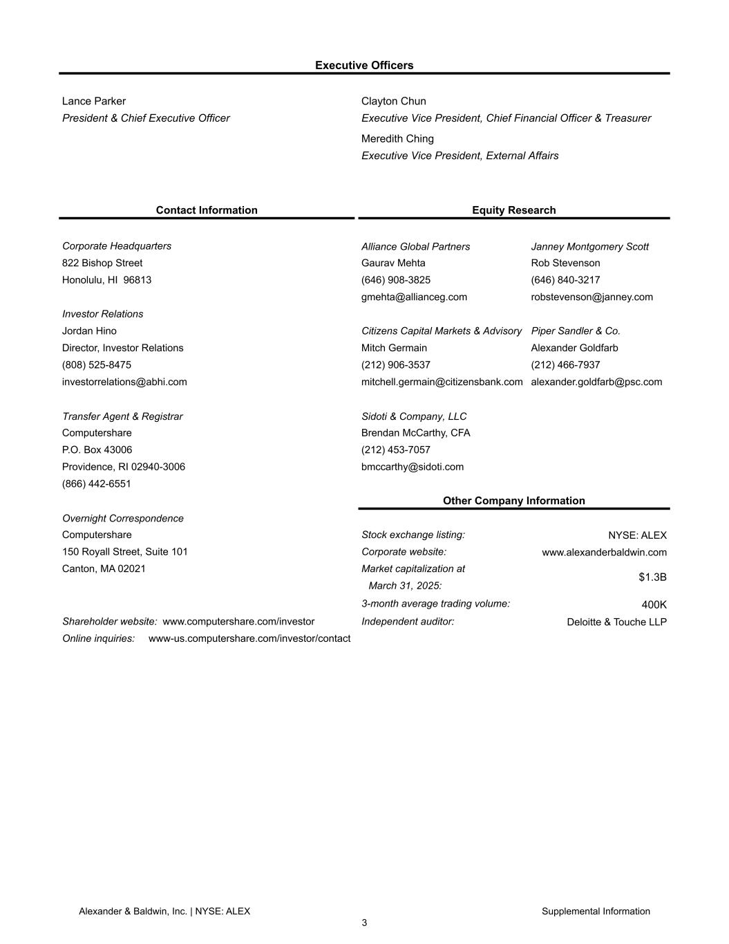 执行官Lance Parker Clayton Chun总裁兼首席执行官执行副总裁、首席财务官兼司库Meredith Ching执行副总裁,对外事务联系信息Equity Research Corporate Headquarters Alliance丨全球合作伙伴丨Janney Montgomery Scott 822 Bishop Street Gaurav Mehta Rob Stevenson Honolulu,HI 96813(646)908-3825(646)840-3217 gmehta@allianceg.com robstevenson@janney.com投资者关系Jordan Hino Citizens Capital Markets & Advisory Piper Sandler & Co.投资者关系总监Mitch Germain Alexander Goldfarb(808)525-8475(212)906-3537(212)466-7937 Investorrelations@abhi.com mitchell.germCFA P.O.Box 43006(212)453-7057 Providence,RI 02940-3006 bmccarthy@sidoti.com(866)442-6551其他公司信息隔夜通讯Computershare证券交易所上市:NYSE:ALEX 150 Royall Street,Suite 101公司网站:www.alexanderbaldwin.com Canton,MA 02021市值为$ 1.3B 2025年3月31日:3个月平均交易量:400k股东网站:www-us.computershare.com/investor/contact丨Alexander & Baldwin,Inc. 丨Alexander & Baldwin, Inc. | NYSE:ALEX补充信息3
