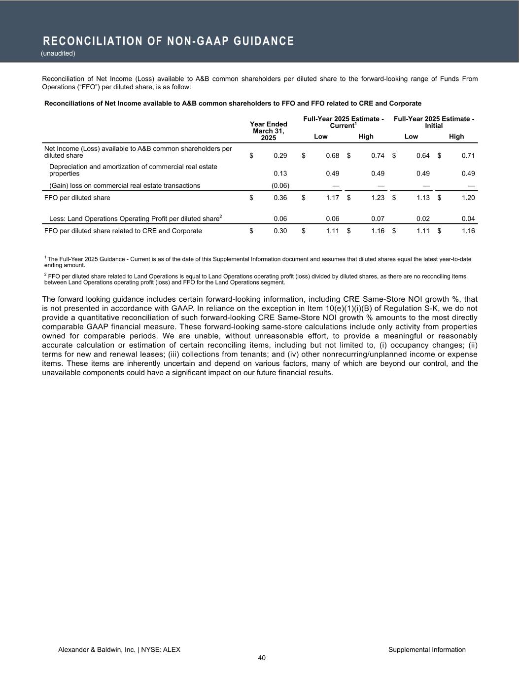 非公认会计准则准则对账(未经审计)A & B普通股股东可获得的每股摊薄净收益(亏损)与每股摊薄收益的前瞻性运营资金范围(“FFO”)的对账,如下:A & B普通股股东可获得的与CRE和公司相关的FFO和FFO的净收入对账截至3月31日的年度,2025年2025年全年估计-当前1 2025年全年估计-A & B普通股股东可获得的初始低-高-低-高净收入(亏损)每股摊薄收益0.29美元0.68美元0.74美元0.64美元0.71美元商业地产物业折旧和摊销0.13 0.49 0.49 0.49 0.49商业地产交易(收益)损失(0.06)————每股摊薄收益0.36美元1.17美元1.23美元1.13美元1.13美元1.13美元1.20减:土地运营业务每股摊薄收益20.06 0.06 0.07 0.02 0.04与CRE相关的每股摊薄收益FFO和企业$ 0.30 $ 1.11 $ 1.16 $ 1.11 $ 1.16 1 2025年全年指引-当前截至本补充信息文件日期,并假设稀释后的股份等于最新的年初至今期末金额。2与土地运营相关的稀释后每股FFO等于土地运营运营利润(亏损)除以稀释后的股份,因为土地运营部门的土地运营运营利润(亏损)和FFO之间没有调节项目。前瞻性指引包括某些前瞻性信息,包括不按照公认会计原则列报的CRE同店NOI增长%。根据S-K条例第10(e)(1)(i)(b)项中的例外情况,我们没有提供此类前瞻性CRE同店NOI增长%与最直接可比的GAAP财务指标的数量对账。这些前瞻性的同店计算仅包括可比期间所拥有物业的活动。如无不合理的努力,我们无法就某些调节项目提供有意义或合理准确的计算或估计,包括但不限于:(i)占用变化;(ii)新租约和续租租约的条款;(iii)向租户收取款项;以及(iv)其他非经常性/非计划收入或支出项目。这些项目本质上是不确定的,取决于各种因素,其中许多因素超出了我们的控制范围,无法获得的组成部分可能会对我们未来的财务业绩产生重大影响。Alexander & Baldwin, Inc. | NYSE:ALEX补充信息40
