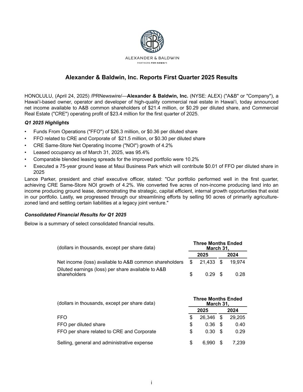 Alexander & Baldwin, Inc.报告2025年第一季度业绩HONOLULU,(2025年4月24日)/美通社/— Alexander & Baldwin, Inc.(NYSE:ALEX)(“A & B”或“公司”)是一家位于夏威夷的夏威夷优质商业地产的所有者、运营商和开发商,该公司今天宣布,A & B普通股股东可获得的净收入为2140万美元,即稀释后每股收益0.29美元,商业房地产(“CRE”)2025年第一季度的营业利润为2340万美元。2025年第一季度亮点•运营资金(“FFO”)2630万美元,或稀释后每股0.36美元•与CRE和企业相关的FFO为2150万美元,或稀释后每股0.30美元• CRE同店净营业收入(“NOI”)增长4.2% •截至2025年3月31日,租赁入住率为95.4% •改进后的投资组合的可比混合租赁价差为10.2% •在毛伊岛商业园执行了为期75年的地面租赁,这将在2025年贡献稀释后每股0.01美元的FFO,总裁兼首席执行官兰斯·帕克,声明:“我们的投资组合在第一季度表现良好,实现了CRE同店NOI增长4.2%。我们将5英亩的非创收土地转换为创收土地租赁,展示了我们投资组合中存在的战略性、资本效率高、内部增长机会。最后,我们通过出售90英亩主要为农业划区的土地并在一家传统合资企业解决某些债务,在精简工作中取得了进展。”2025年第一季度合并财务业绩以下是部分合并财务业绩的摘要。(以千美元计,每股数据除外)截至2025年3月31日的三个月2024年A & B普通股股东可获得的净收入(亏损)21,433美元19,974美元A & B股东可获得的稀释后每股收益(亏损)0.29美元0.28美元(以千美元计,每股数据除外)截至2025年3月31日的三个月2024年FFO 26,346美元29,205美元FFO每股摊薄收益0.36美元0.40美元FFO每股与CRE和企业相关的0.30美元0.29美元销售、一般和管理费用6,990美元7,239美元i