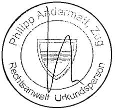 Hiermit beglaubige ich, Urkundsperson des Kantons Zug, Philipp Andermatt, Rechtsanwalt, dass die vorliegenden Statuten derjenigen Fassung entsprechen, wie sie heute von der erschienen Person gutgeheissen wurden. |