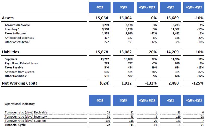应用于该业务的净营运资本在23年第四季度为负数6.24亿雷亚尔,这一结果大大低于上一季度,主要是由于供应商业务增加了22%。