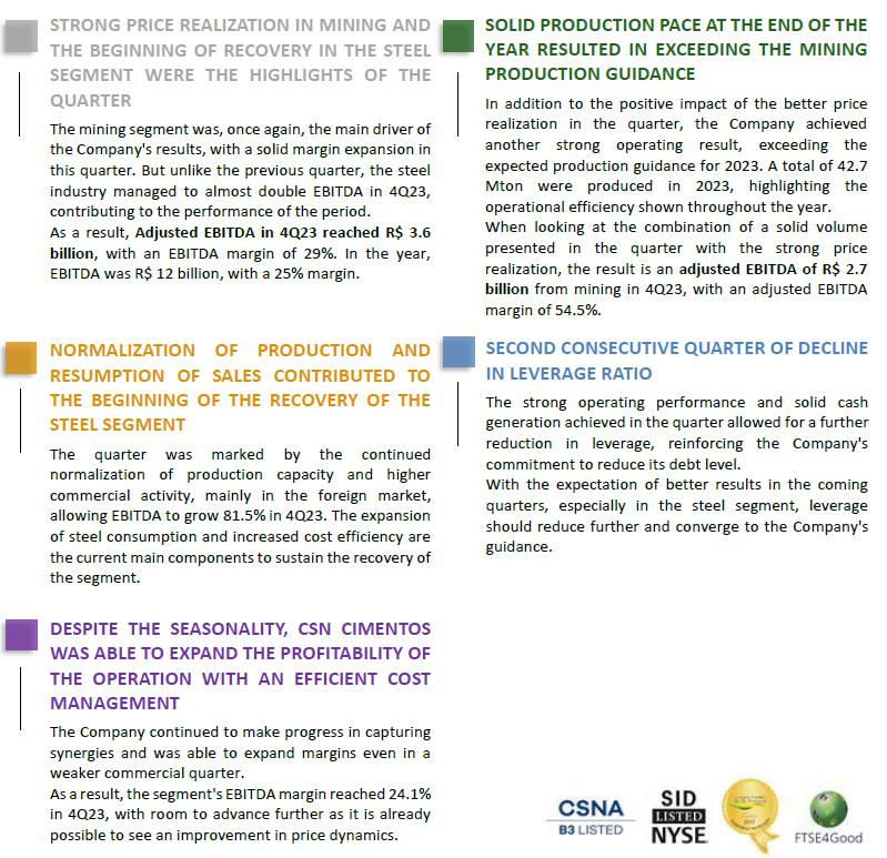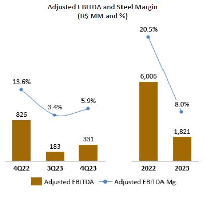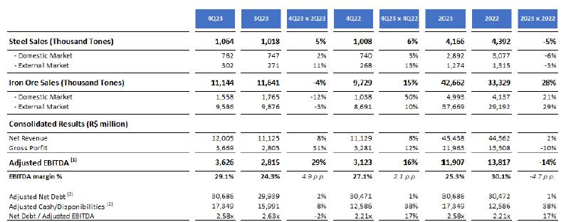 | · | The钢铁板块的调整后EBITDA达到2023年第四季度3.31亿雷亚尔比Q3高出81.5%,调整后EBITDA利润率为5.9%(+ 2.4个百分点)。这一结果结合了更强劲的国外市场和以自信的商业战略改善运营为标志的国内表现。从这个意义上说,重要的是要强调这种较低盈利能力的暂时影响,因为所有必要的调整都在进行中,并且已经可以观察到国内市场价格的复苏。2023年钢铁板块调整后EBITDA达18.21亿雷亚尔,EBITDA利润率为8.0%,较2022年减少69.7%。 |