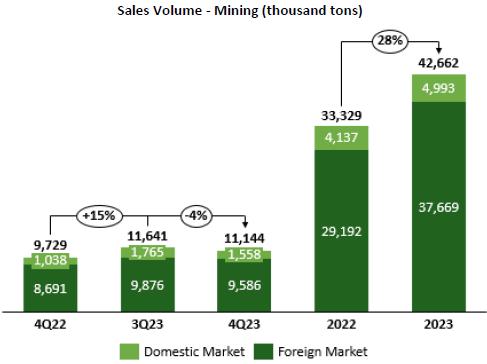 | · | 销量,进而在2023年第四季度达到11,144千吨,仅比上季度创下的纪录低4.3%,比去年同期高出14.5%。该公司再次能够利用中国需求强劲的有利环境条件以及一年中这个时候降雨量比平时少的时期,在本季度实现了高水平的销售。2023年销量达4.2662万吨,较2022年增长28%。 |