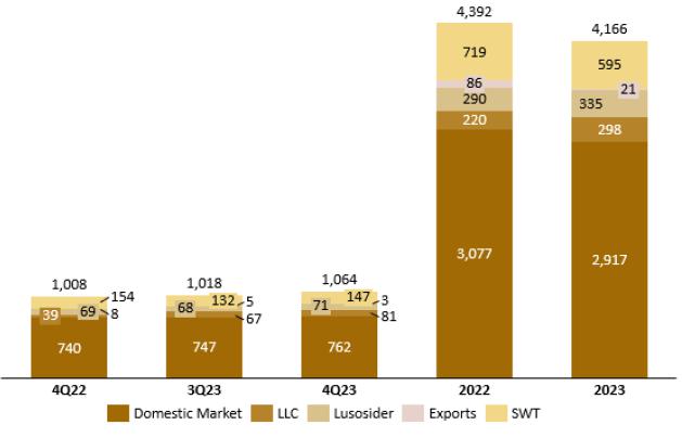 铁路物流:4Q23净营收达7.28亿雷亚尔,调整后EBITDA为3.36亿雷亚尔,调整后EBITDA利润率为46.2%。与Q3相比,收入基本稳定,但调整后EBITDA低17.3%。年初至今,2023年净营收达到26.45亿雷亚尔,同比增长14.4%,而调整后EBITDA增长21.2%,达到13.39亿雷亚尔,EBITDA利润率为50.6%。