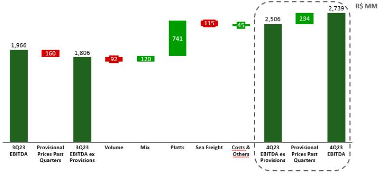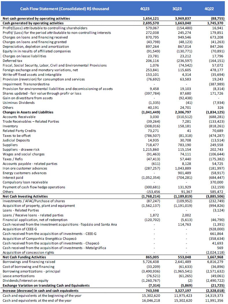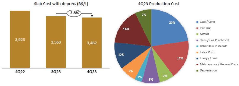 | · | 反过来,板坯成本在23年第四季度达到3,462雷亚尔/吨,较上季度减少2.8%,这是逐步运营正常化的结果。 |