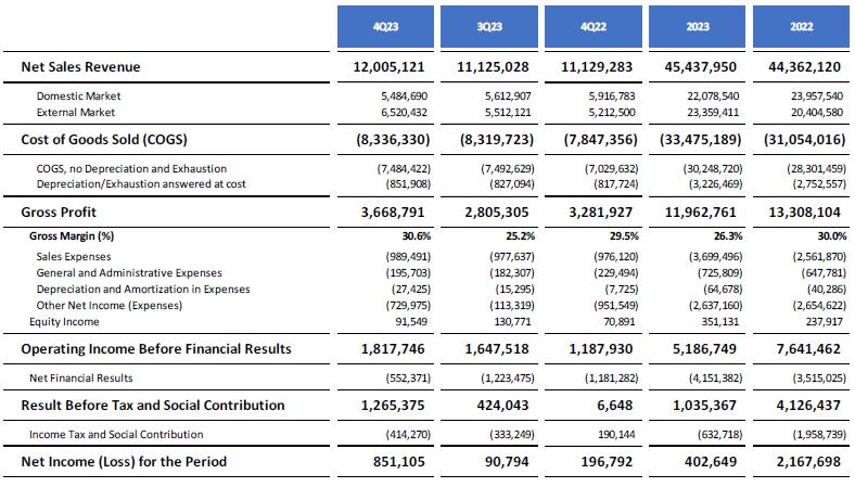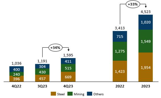 ·4Q23净营收总计1200.05亿雷亚尔,较3Q23增长7.9%,主要是由于在普氏能源上涨的情况下,采矿部门的价格实现有所改善,此外该期间钢材销量增加。2023年,净收入总计454.38亿雷亚尔,对应的年增长率为2.4%,反映出(i)当年铁矿石销量创纪录(与2022年相比增长27.2%)和(ii)水泥业务的增长。