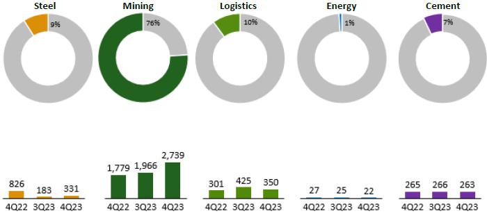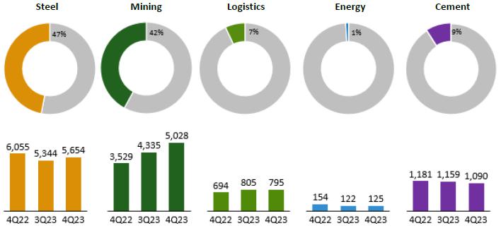 | 4Q23业绩(百万雷亚尔) | 钢铁 | 采矿 | 物流(港口) | 物流(铁路) | 能源 | 水泥 | 企业开支/ 消除 |