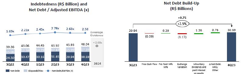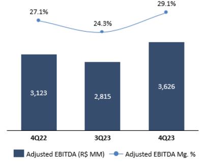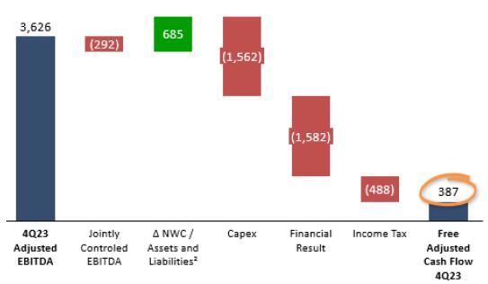 23年第4季度调整后现金流为正数3.87亿雷亚尔,投资和财务费用增加抵消了稳健的经营业绩和高效的营运资金管理。