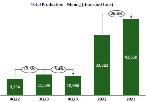 | · | 4Q23铁矿石产量总计10,966千吨,与Q3的创纪录产量相比下降5.4%,这是由于进入雨季已经在预期中,但与上年同期相比增长了17.5%。在连续两个记录后,该季度的产量继续保持在非常高的水平,导致业绩高于2023年的预期,这证明了公司全年实现的卓越运营。2023年共生产42,650公吨,年增长26.6%。 |