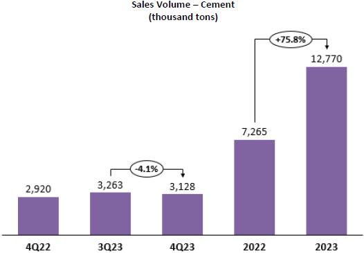 | · | 4Q23,水泥COGS与上一季度相比下降15%,这是由于捕捉到了运营协同效应。 |