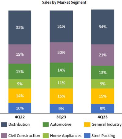 关于总销量,4Q23的主要亮点是分销部分,与上一季度销量相比增长了24.7%。另一方面,家电(-19.8 %)和汽车(-12.5 %)板块由于期间的季节性,出现在主要的负面亮点中。同比来看,通用工业、钢铁包装和汽车行业出现重要复苏,但其他细分行业出现下滑。