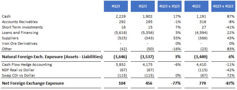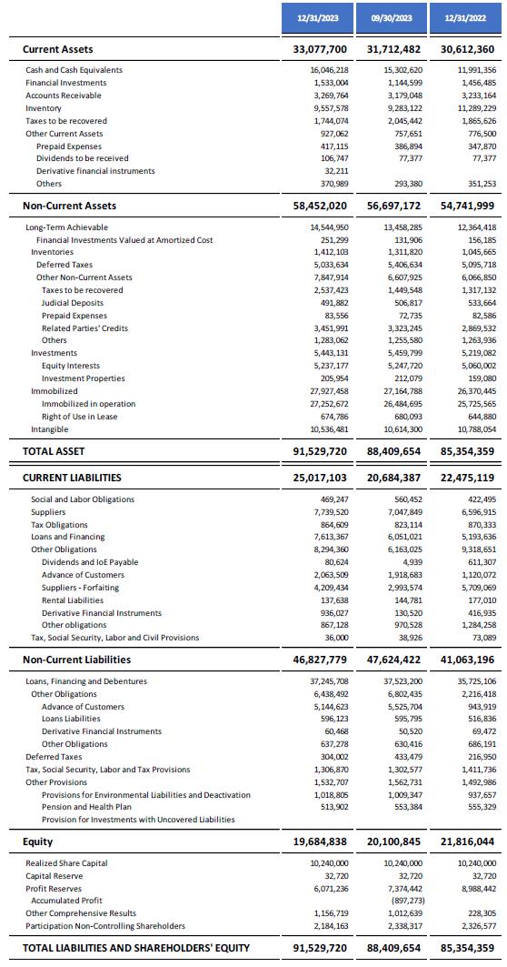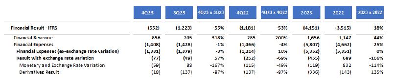 ·在2023年第四季度,财务业绩为负数5.52亿雷亚尔,与上一季度相比减少了55%,原因是Usiminas的股票升值,此外该期间的债务成本较低。2023年,财务结果为负42亿雷亚尔,比上年高出18%,这反映了观察到的汇率变动对财务费用的影响。