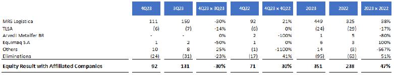 ·由于MRS业绩的季节性下降,股权结果在2023年第四季度为正数9200万雷亚尔,与上一季度相比减少了30%。2023年,由于MRS全年实现了稳健的业绩表现,权益结果达到3.51亿雷亚尔,年增长47%。