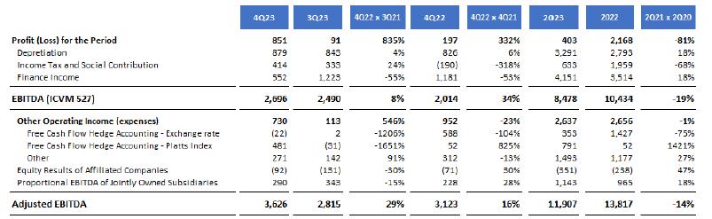 | · | 23年第四季度调整后EBITDA达到27.39亿雷亚尔,季度经调整EBITDA利润率为54.5%或9.1个百分点,高于上季度。这一富有表现力的结果,是铁矿石价格向好和销量高企共同作用的结果,产生了反映雨季运营改善的非凡表现。2023年,调整后EBITDA达到78.43亿雷亚尔,与上一年相比增长29.2%,这反映了实现的生产和销售记录,此外该年还看到了强劲的价格实现。 |