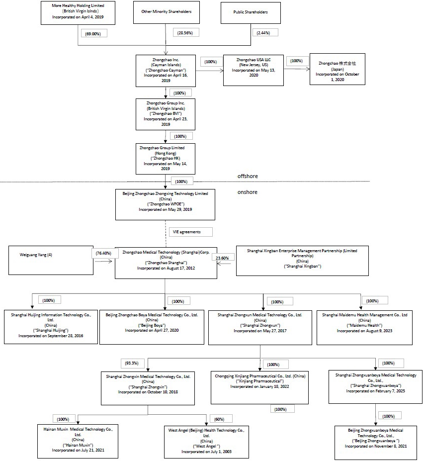 众巢医学有限公司(“公司”或“中超开曼”)是一家在开曼群岛注册成立为获豁免有限责任公司的离岸控股公司。中超开曼不是一家中国运营公司,而是一家开曼群岛控股公司,没有自己的实质性运营。Zhongchao Cayman透过于中华人民共和国(“中国”或“中国”)注册成立的Zhongchao Cayman全资附属公司Beijing Zhongchao Zhongxing Technology Limited(“Zhongchao WFOE”)与可变利益实体(“VIE”)、Zhongchao Medical Technology(Shanghai)Co.,Ltd.(“Zhongchao Shanghai”)及其附属公司(与VIE合称“中国经营实体”)之间的合约安排(“合约安排”),综合中国经营实体的财务业绩。我们之所以选择这样的VIE结构,是因为中国法律法规对从事增值电信服务和某些其他业务的公司的外资所有权施加了限制,而中国的运营实体在中国经营其外商投资受到限制或禁止的业务。有关VIE合同安排的说明,请参阅本招股说明书第5页开始的“招股说明书摘要-我们的公司Structure —中超WFOE与中超上海的合同安排”。