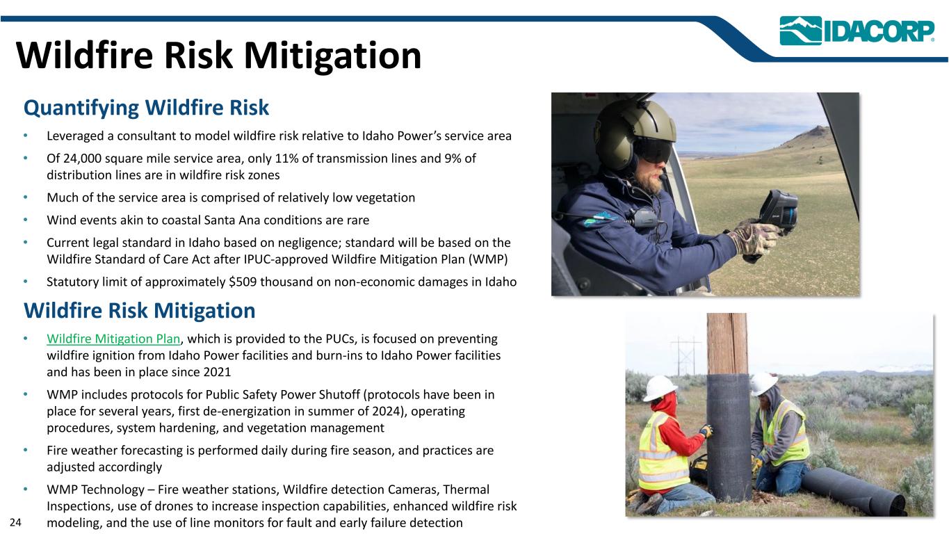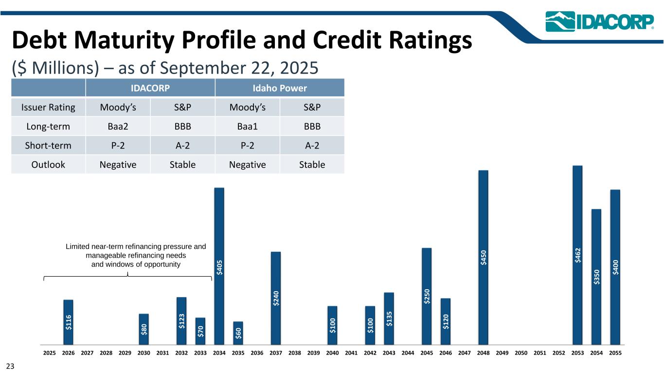 债务到期状况和信用评级(百万美元)–截至9月22日,2025 $ 116 $ 80 $ 123 $ 70 $ 405 $ 60 $ 240 $ 100 $ 100 $ 100 $ 135 $ 250 $ 120 $ 450 $ 462 $ 350 $ 4002025202620272028202920302031203220332034203520362037203820392040204120422043204420452046204720482049205020512052205320542055近期再融资压力有限以及可控的再融资需求和机会窗口IDACORP Idaho Power发行人评级穆迪标普Moody'sTERM1长期 Baa2 BBB Baa1 BBB短期P-2 A-2 P-2 A-2展望负面稳定负面稳定23