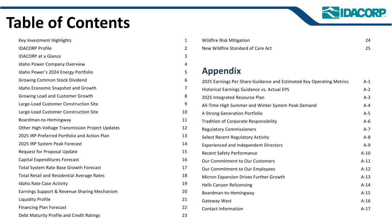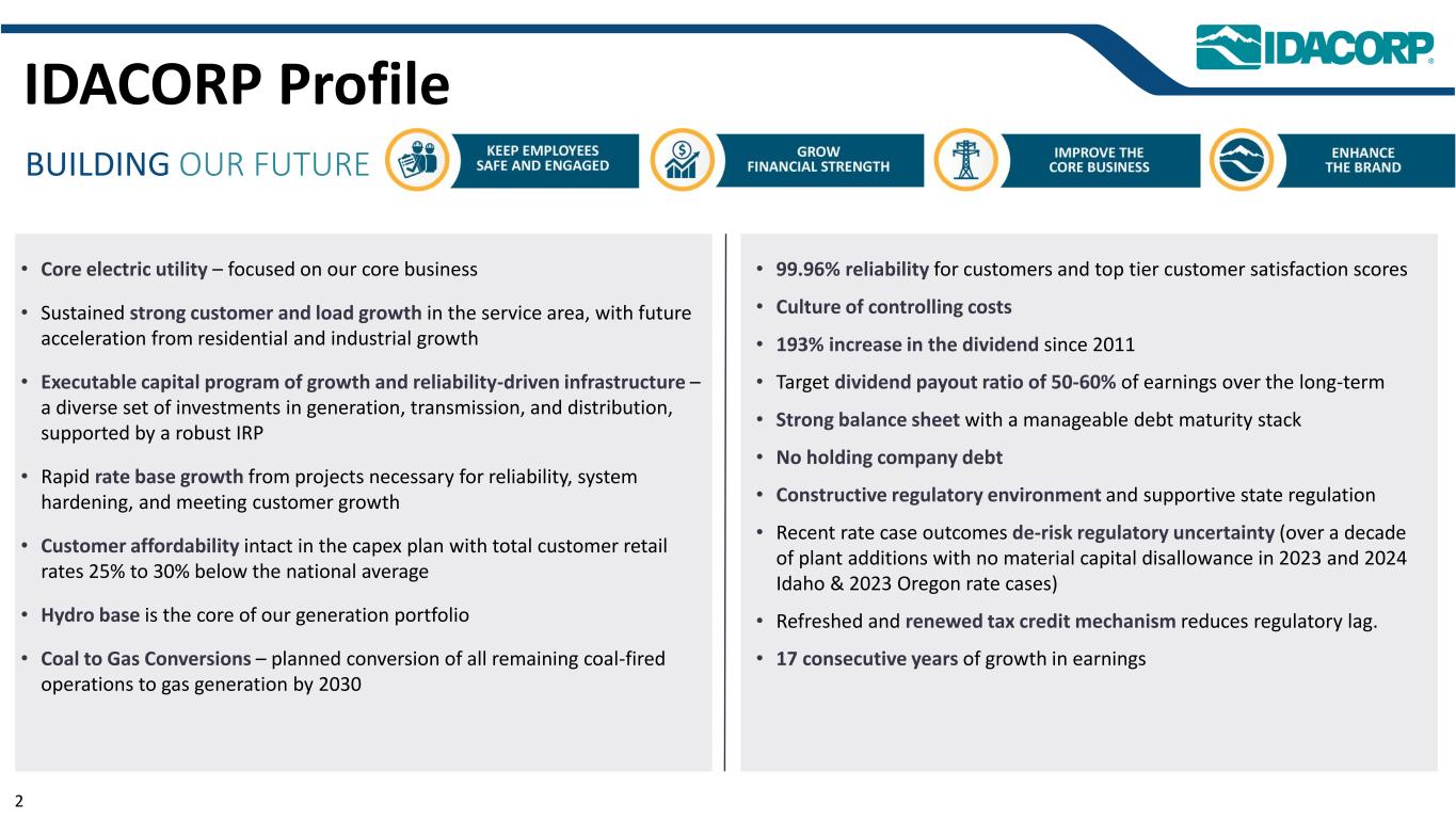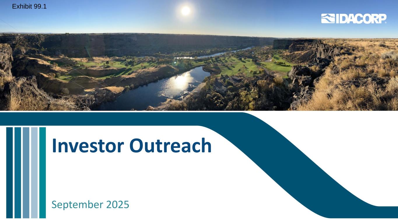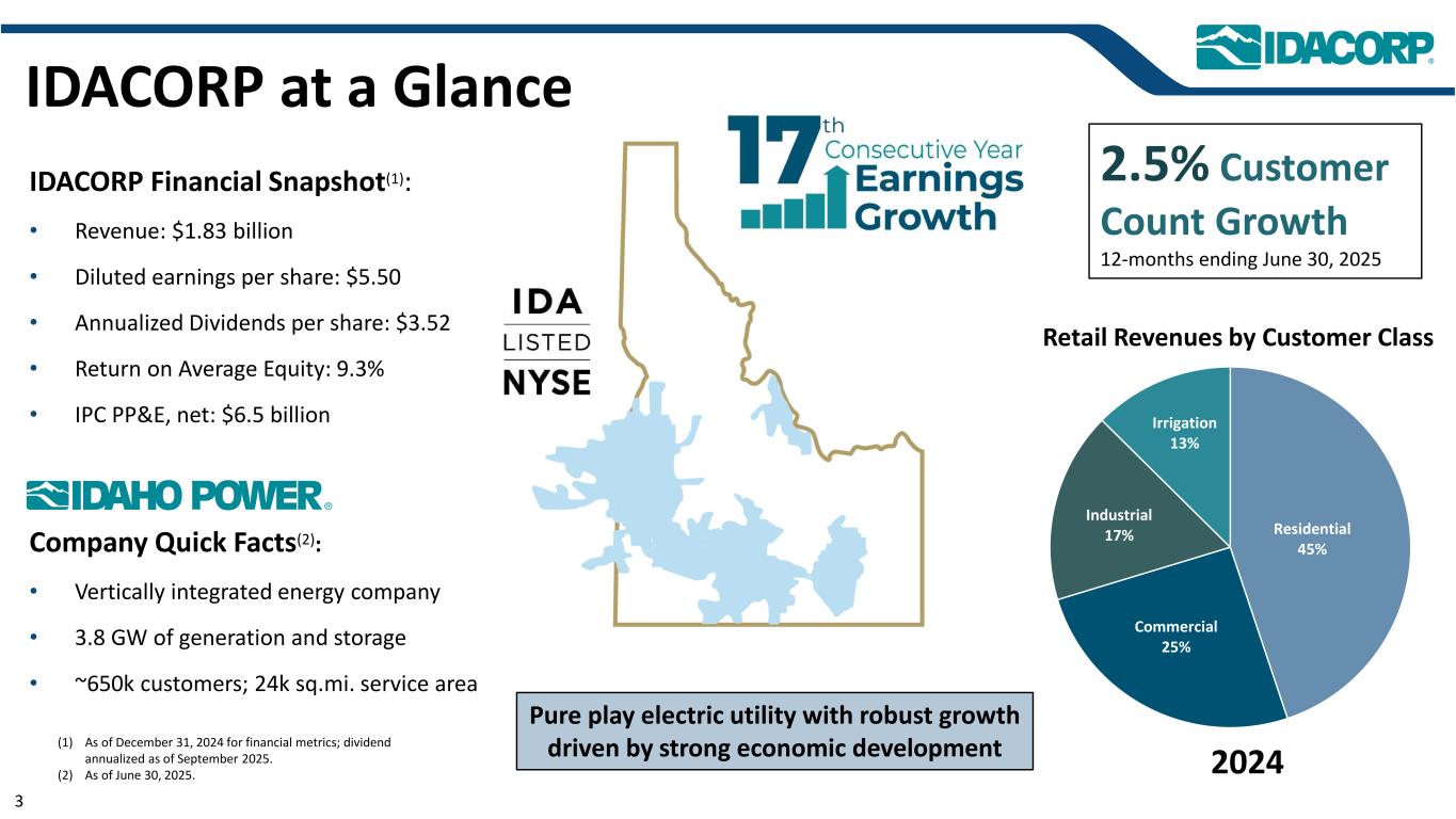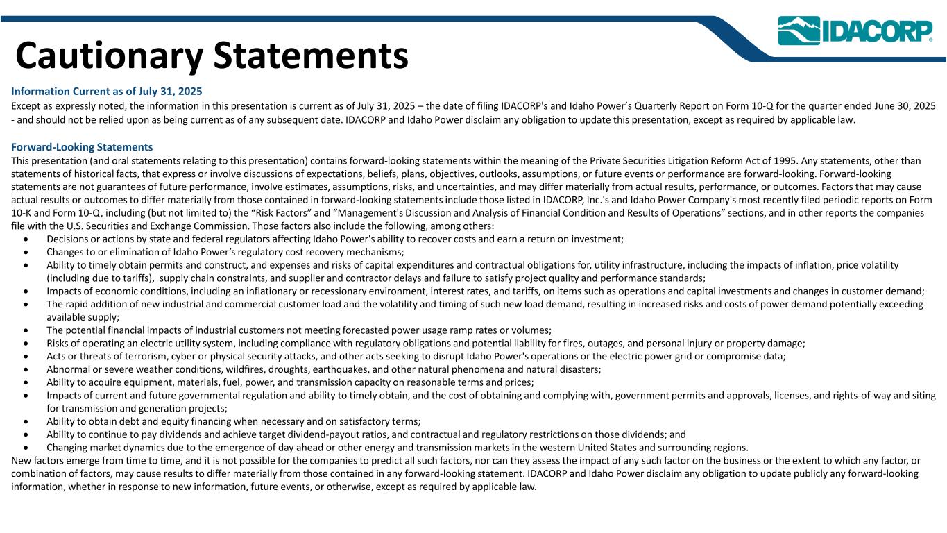 警示性声明信息截至2025年7月31日的最新信息除明确注明外,本演示文稿中的信息截至2025年7月31日——即提交IDACORP和爱达荷电力公司截至2025年6月30日止季度的10-Q表格季度报告的日期——并且不应被视为截至任何后续日期的最新信息。除非适用法律要求,否则IDACORP和Idaho Power不承担更新本演示文稿的任何义务。前瞻性陈述本演示文稿(以及与本演示文稿相关的口头陈述)包含1995年《私人证券诉讼改革法案》含义内的前瞻性陈述。除历史事实陈述外,任何表达或涉及对期望、信念、计划、目标、前景、假设或未来事件或表现的讨论的陈述都是前瞻性的。前瞻性陈述不是对未来业绩的保证,涉及估计、假设、风险和不确定性,可能与实际结果、业绩或结果存在重大差异。可能导致实际结果或结果与前瞻性陈述中包含的结果或结果存在重大差异的因素包括IDACORP, Inc.和爱达荷电力公司最近提交的关于表格10-K和表格10-Q的定期报告中列出的因素,包括(但不限于)“风险因素”和“管理层对财务状况和运营结果的讨论和分析”部分,以及公司向美国证券交易委员会提交的其他报告中的因素。除其他外,这些因素还包括:•州和联邦监管机构做出的影响Idaho Power收回成本和赚取投资回报能力的决定或行动;•更改或取消Idaho Power的监管成本回收机制;•及时获得许可和建设的Ability,以及公用事业基础设施的资本支出和合同义务的费用和风险,包括通货膨胀、价格波动(包括由于关税)、供应链限制以及供应商和承包商的延误和未能达到项目质量和性能标准的影响;•经济状况的影响,包括通货膨胀或衰退环境、利率和关税,对运营和资本投资以及客户需求的变化等项目;•快速增加新的工商业客户负荷以及此类新负荷需求的波动性和时间安排,导致电力需求可能超过可用供应的风险和成本增加;•工业客户未达到预测的用电爬坡率或电量的潜在财务影响;•运营电力公用事业系统的风险,包括遵守监管义务和火灾、停电的潜在责任,以及人身伤害或财产损失;•恐怖主义行为或威胁、网络或实体安全攻击,以及其他试图扰乱爱达荷电力公司的运营或电网或泄露数据的行为;•异常或恶劣的天气条件、野火、干旱、地震以及其他自然现象和自然灾害;•以合理的条款和价格获得设备、材料、燃料、动力和传输能力的Ability;•当前和未来政府监管和及时获得能力的影响,以及获得和遵守政府许可和批准、许可、许可、许可、许可、许可、许可、许可、许可、许可、许可、许可、许可、许可、许可、许可、许可、许可、许可、许可、许可、许可、许可、许可、许可、许可、许可、许可、许可、许可、许可、许可、许可、许可、许可、许可、许可、许可以及输电和发电项目的通行权和选址;•在必要时以令人满意的条件获得债务和股权融资的Ability;• Ability继续支付股息并实现目标派息率,以及对这些股息的合同和监管限制;以及•由于美国西部及周边地区出现超前或其他能源和输电市场而不断变化的市场动态。新的因素不时出现,公司无法预测所有这些因素,也无法评估任何此类因素对业务的影响或任何因素或因素组合可能导致结果与任何前瞻性陈述中包含的结果存在重大差异的程度。IDACORP和Idaho Power不承担任何公开更新任何前瞻性信息的义务,无论是针对新信息、未来事件或其他情况,除非适用法律要求。
