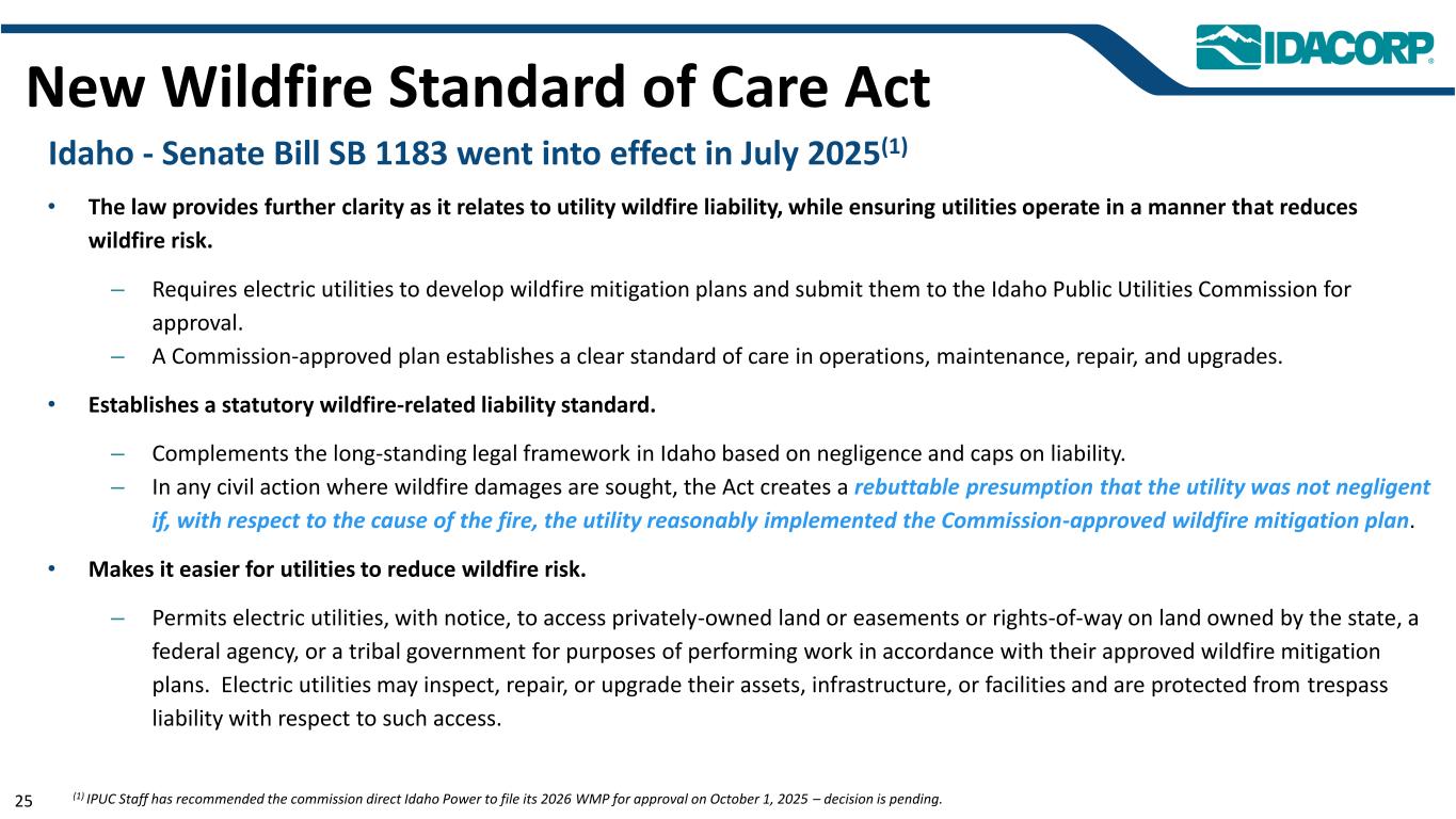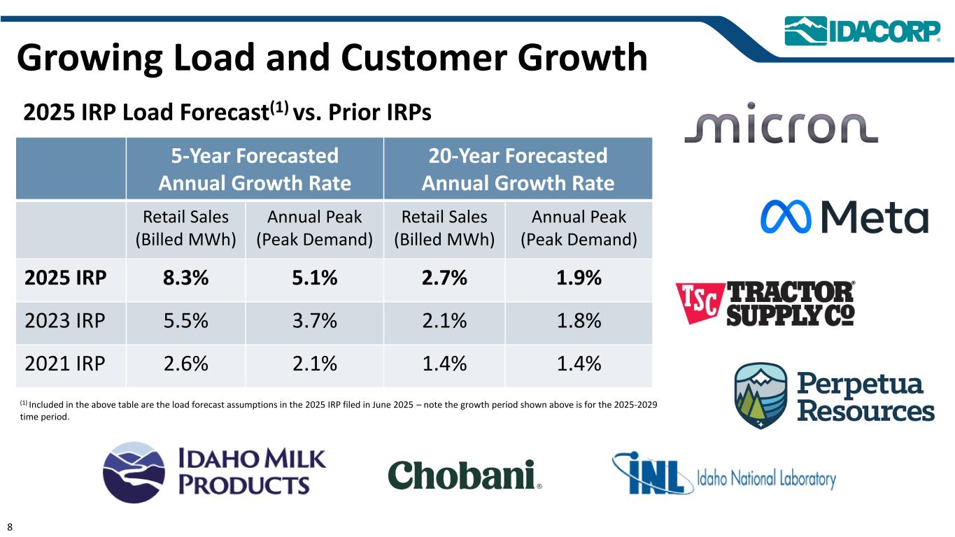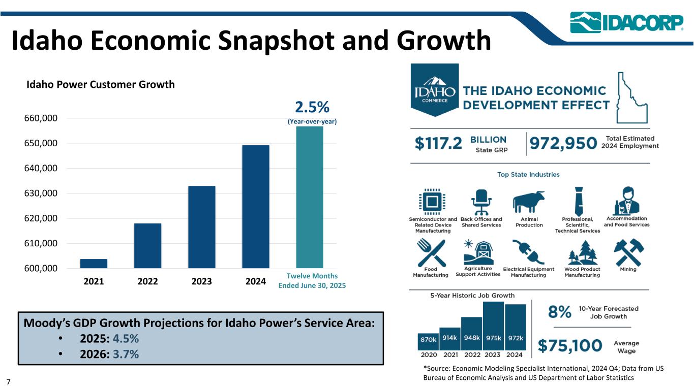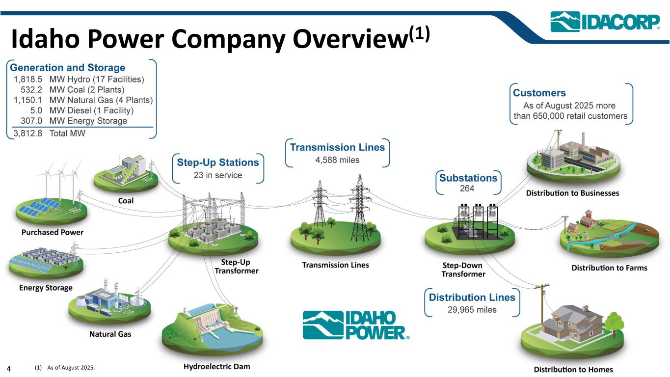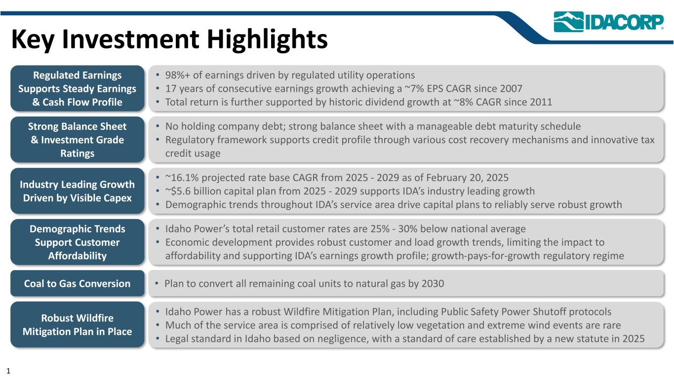 警示性声明信息截至2025年7月31日的最新信息除明确注明外,本演示文稿中的信息截至2025年7月31日——即提交IDACORP和爱达荷电力公司截至2025年6月30日止季度的10-Q表格季度报告的日期——并且不应被视为截至任何后续日期的最新信息。除非适用法律要求,否则IDACORP和Idaho Power不承担更新本演示文稿的任何义务。前瞻性陈述本演示文稿(以及与本演示文稿相关的口头陈述)包含1995年《私人证券诉讼改革法案》含义内的前瞻性陈述。除历史事实陈述外,任何表达或涉及对期望、信念、计划、目标、前景、假设或未来事件或表现的讨论的陈述都是前瞻性的。前瞻性陈述不是对未来业绩的保证,涉及估计、假设、风险和不确定性,可能与实际结果、业绩或结果存在重大差异。可能导致实际结果或结果与前瞻性陈述中包含的结果或结果存在重大差异的因素包括IDACORP, Inc.和爱达荷电力公司最近提交的关于表格10-K和表格10-Q的定期报告中列出的因素,包括(但不限于)“风险因素”和“管理层对财务状况和运营结果的讨论和分析”部分,以及公司向美国证券交易委员会提交的其他报告中的因素。除其他外,这些因素还包括:•州和联邦监管机构做出的影响Idaho Power收回成本和赚取投资回报能力的决定或行动;•更改或取消Idaho Power的监管成本回收机制;•及时获得许可和建设的Ability,以及公用事业基础设施的资本支出和合同义务的费用和风险,包括通货膨胀、价格波动(包括由于关税)、供应链限制以及供应商和承包商的延误和未能达到项目质量和性能标准的影响;•经济状况的影响,包括通货膨胀或衰退环境、利率和关税,对运营和资本投资以及客户需求的变化等项目;•快速增加新的工商业客户负荷以及此类新负荷需求的波动性和时间安排,导致电力需求可能超过可用供应的风险和成本增加;•工业客户未达到预测的用电爬坡率或电量的潜在财务影响;•运营电力公用事业系统的风险,包括遵守监管义务和火灾、停电的潜在责任,以及人身伤害或财产损失;•恐怖主义行为或威胁、网络或实体安全攻击,以及其他试图扰乱爱达荷电力公司的运营或电网或泄露数据的行为;•异常或恶劣的天气条件、野火、干旱、地震以及其他自然现象和自然灾害;•以合理的条款和价格获得设备、材料、燃料、动力和传输能力的Ability;•当前和未来政府监管和及时获得能力的影响,以及获得和遵守政府许可和批准、许可、许可、许可、许可、许可、许可、许可、许可、许可、许可、许可、许可、许可、许可、许可、许可、许可、许可、许可、许可、许可、许可、许可、许可、许可、许可、许可、许可、许可、许可、许可、许可、许可、许可、许可、许可、许可以及输电和发电项目的通行权和选址;•在必要时以令人满意的条件获得债务和股权融资的Ability;• Ability继续支付股息并实现目标派息率,以及对这些股息的合同和监管限制;以及•由于美国西部及周边地区出现超前或其他能源和输电市场而不断变化的市场动态。新的因素不时出现,公司无法预测所有这些因素,也无法评估任何此类因素对业务的影响或任何因素或因素组合可能导致结果与任何前瞻性陈述中包含的结果存在重大差异的程度。IDACORP和Idaho Power不承担任何公开更新任何前瞻性信息的义务,无论是针对新信息、未来事件或其他情况,除非适用法律要求。
