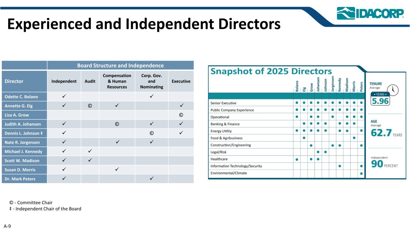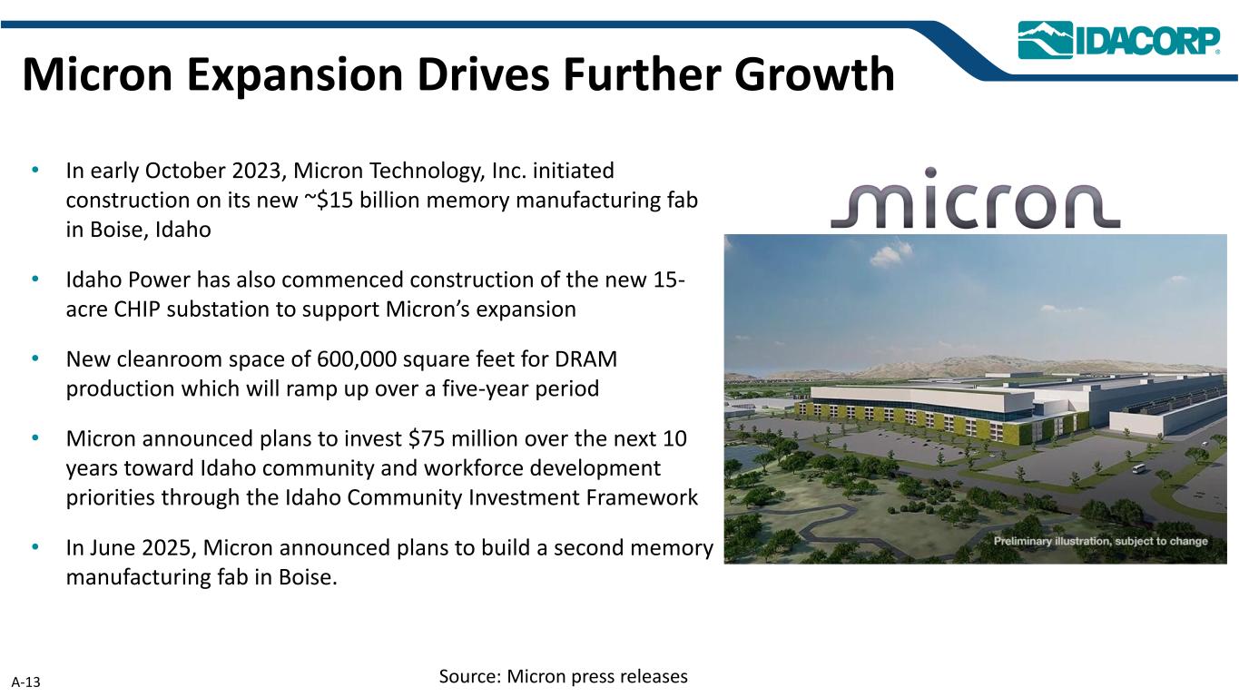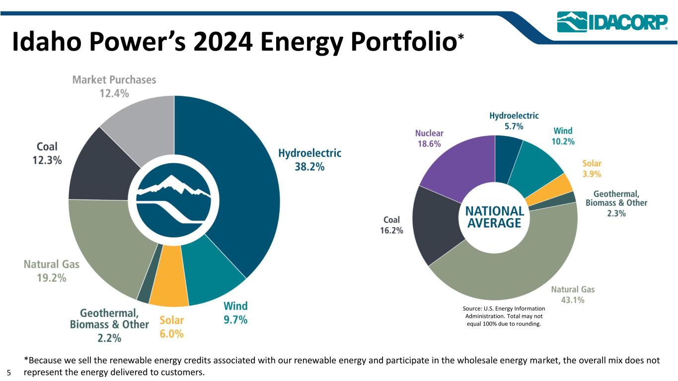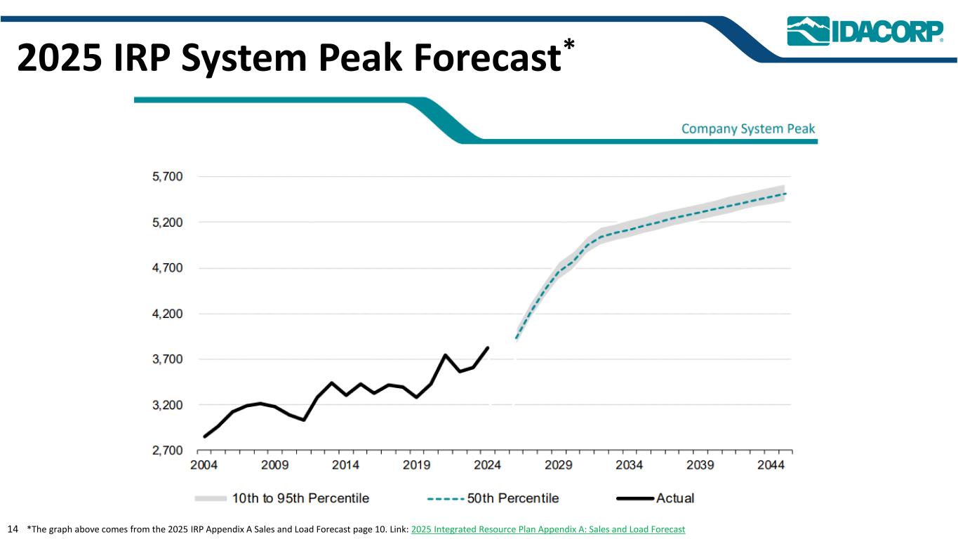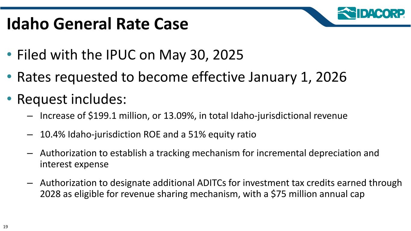 警示性声明信息截至2025年7月31日的最新信息除明确注明外,本演示文稿中的信息截至2025年7月31日——即提交IDACORP和爱达荷电力公司截至2025年6月30日止季度的10-Q表格季度报告的日期——并且不应被视为截至任何后续日期的最新信息。除非适用法律要求,否则IDACORP和Idaho Power不承担更新本演示文稿的任何义务。前瞻性陈述本演示文稿(以及与本演示文稿相关的口头陈述)包含1995年《私人证券诉讼改革法案》含义内的前瞻性陈述。除历史事实陈述外,任何表达或涉及对期望、信念、计划、目标、前景、假设或未来事件或表现的讨论的陈述都是前瞻性的。前瞻性陈述不是对未来业绩的保证,涉及估计、假设、风险和不确定性,可能与实际结果、业绩或结果存在重大差异。可能导致实际结果或结果与前瞻性陈述中包含的结果或结果存在重大差异的因素包括IDACORP, Inc.和爱达荷电力公司最近提交的关于表格10-K和表格10-Q的定期报告中列出的因素,包括(但不限于)“风险因素”和“管理层对财务状况和运营结果的讨论和分析”部分,以及公司向美国证券交易委员会提交的其他报告中的因素。除其他外,这些因素还包括:•州和联邦监管机构做出的影响Idaho Power收回成本和赚取投资回报能力的决定或行动;•更改或取消Idaho Power的监管成本回收机制;•及时获得许可和建设的Ability,以及公用事业基础设施的资本支出和合同义务的费用和风险,包括通货膨胀、价格波动(包括由于关税)、供应链限制以及供应商和承包商的延误和未能达到项目质量和性能标准的影响;•经济状况的影响,包括通货膨胀或衰退环境、利率和关税,对运营和资本投资以及客户需求的变化等项目;•快速增加新的工商业客户负荷以及此类新负荷需求的波动性和时间安排,导致电力需求可能超过可用供应的风险和成本增加;•工业客户未达到预测的用电爬坡率或电量的潜在财务影响;•运营电力公用事业系统的风险,包括遵守监管义务和火灾、停电的潜在责任,以及人身伤害或财产损失;•恐怖主义行为或威胁、网络或实体安全攻击,以及其他试图扰乱爱达荷电力公司的运营或电网或泄露数据的行为;•异常或恶劣的天气条件、野火、干旱、地震以及其他自然现象和自然灾害;•以合理的条款和价格获得设备、材料、燃料、动力和传输能力的Ability;•当前和未来政府监管和及时获得能力的影响,以及获得和遵守政府许可和批准、许可、许可、许可、许可、许可、许可、许可、许可、许可、许可、许可、许可、许可、许可、许可、许可、许可、许可、许可、许可、许可、许可、许可、许可、许可、许可、许可、许可、许可、许可、许可、许可、许可、许可、许可、许可、许可以及输电和发电项目的通行权和选址;•在必要时以令人满意的条件获得债务和股权融资的Ability;• Ability继续支付股息并实现目标派息率,以及对这些股息的合同和监管限制;以及•由于美国西部及周边地区出现超前或其他能源和输电市场而不断变化的市场动态。新的因素不时出现,公司无法预测所有这些因素,也无法评估任何此类因素对业务的影响或任何因素或因素组合可能导致结果与任何前瞻性陈述中包含的结果存在重大差异的程度。IDACORP和Idaho Power不承担任何公开更新任何前瞻性信息的义务,无论是针对新信息、未来事件或其他情况,除非适用法律要求。