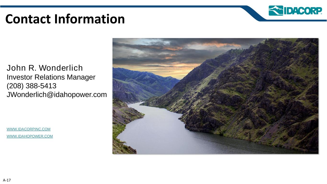 联系方式www.IDACORPINC.COM www.IDAHOPOWER.com John R. Wonderlich投资者关系经理(208)388-5413 JWonderlich@idahopower.com A-17