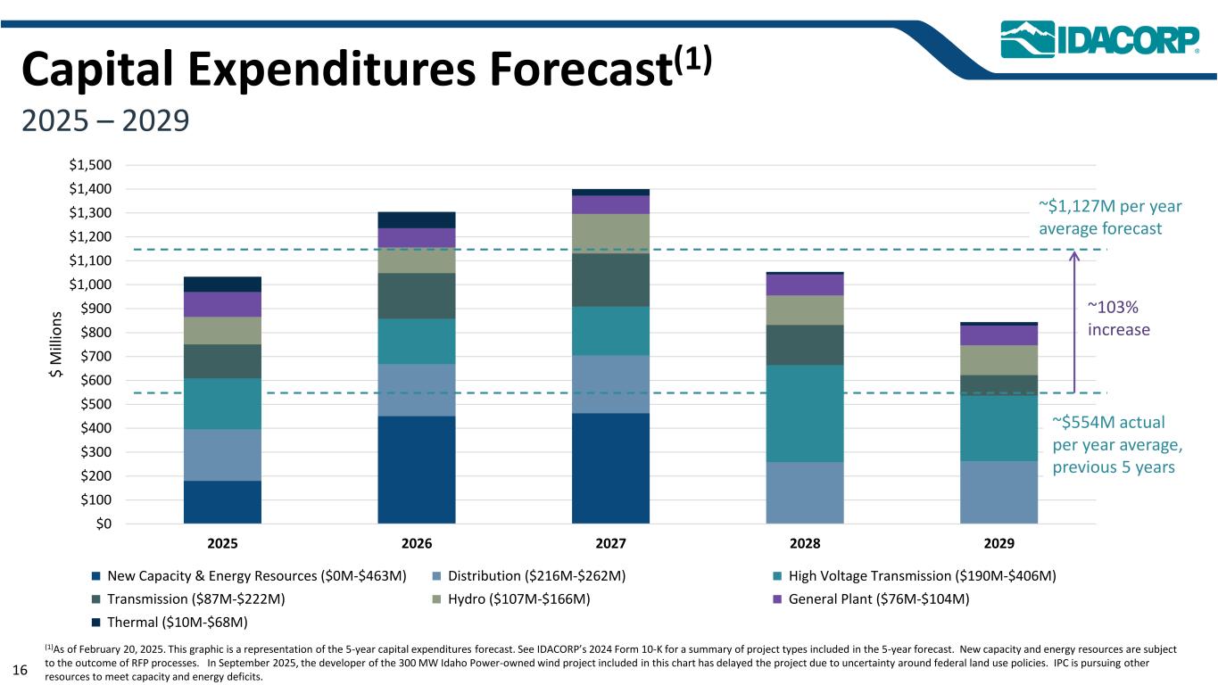 资本支出预测(1)2025 – 2029年0美元100美元200美元300美元400美元500美元600美元700美元800美元900美元1000美元1,100美元1,100美元1,200美元1,300美元1,400美元1,500美元1,500美元202520262027美元20282029美元mill io n s new capacity & energy resources($ 0m-$ 4.63亿)distribution($ 2.16m-$ 2.62m)high voltage transmission($ 1.90m-$ 4.06m)transmission($ 87m-$ 2.22m)hydro($ 1.07m-$ 1.66m)general plant($ 76m-$ 1.04m)thermal($ 10m-$ 68m)(1这张图是5年资本支出预测的表示。有关5年预测中包含的项目类型摘要,请参阅IDACORP的2024年10-K表。新增产能和能源资源取决于RFP工艺的结果。2025年9月,这张图表中包含的300兆瓦爱达荷州电力拥有的风力项目的开发商由于联邦土地使用政策的不确定性而推迟了该项目。IPC正在寻求其他资源来满足产能和能源不足的问题。~5.54亿美元实际每年平均,前5年~103%增长~11.27亿美元每年平均预测16