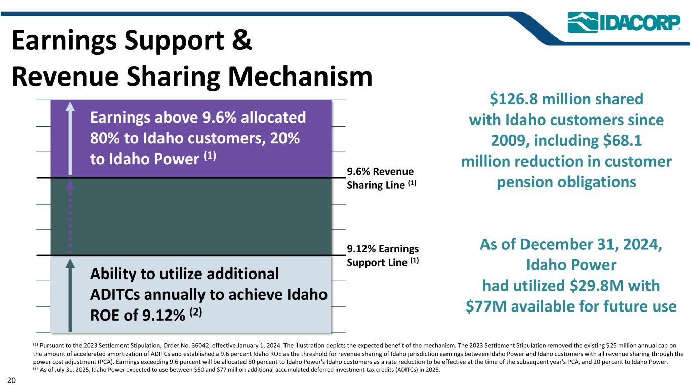 收益支持和收入分享机制(1)根据2023年结算规定,第36042号令,2024年1月1日生效。该插图描述了该机制的预期收益。2023年的和解规定取消了ADITC加速摊销金额现有的2500万美元年度上限,并确立了9.6%的爱达荷州ROE作为爱达荷州电力公司和爱达荷州客户之间通过电力成本调整(PCA)进行所有收入分享的爱达荷州辖区收益的收入分享门槛。收益超过9.6%将分配80%给Idaho Power的Idaho客户,作为在下一年PCA时生效的费率下调,20%分配给Idaho Power。(2)截至2025年7月31日,爱达荷电力公司预计将在2025年使用60至7700万美元的额外累积递延投资税收抵免(ADITC)。每年利用额外ADITC实现爱达荷州ROE为9.12%的Ability(2)9.12%盈利支撑线(1)9.6%收入分享线(1)9.6%以上盈利分配80%给爱达荷州客户,20%分配给爱达荷州电力(1)截至2024年12月31日,爱达荷州电力已使用2980万美元,其中7700万美元可供未来使用自2009年以来与爱达荷州客户共享的1.268亿美元,其中包括减少的6810万美元客户养老金义务20
