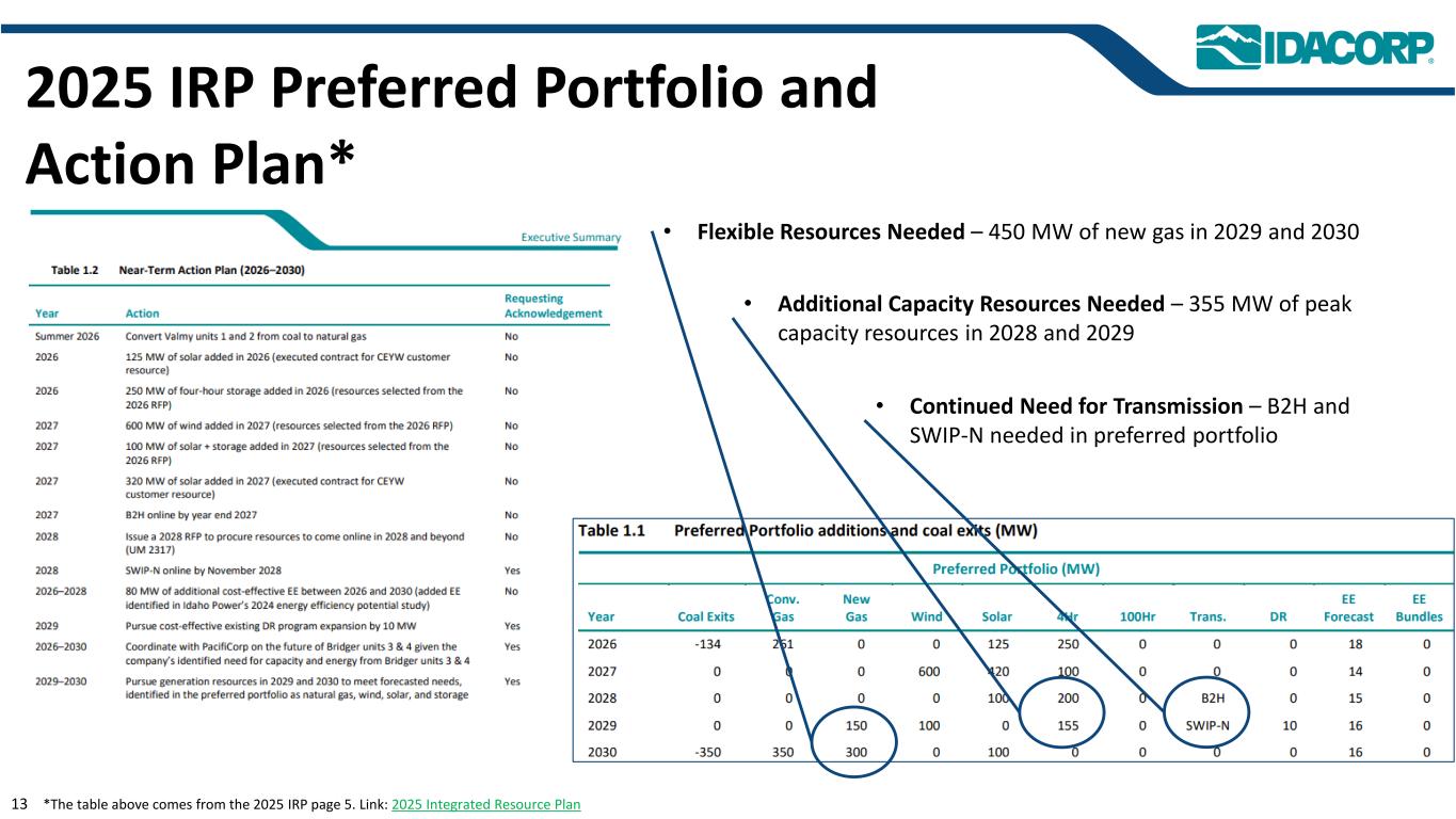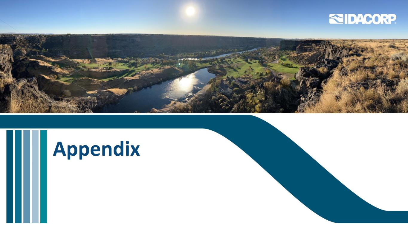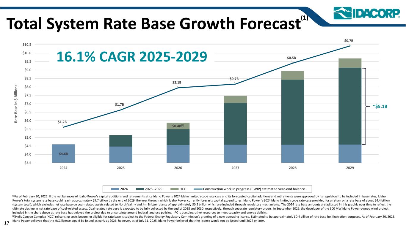 $ 4.6B $ 0.4B(2)$ 1.2B $ 1.7B $ 2.1B $ 0.7B $ 0.5B $ 0.7B $ 3.5 $ 4.0 $ 4.5 $ 5.0 $ 5.5 $ 6.0 $ 6.5 $ 7.0 $ 7.5 $ 8.0 $ 8.5 $ 9.0 $ 9.5 $ 9.5 $ 10.5 $ 10.5 20242025202620220282029 R at e B as e in $ B ill io n s 20242025-2029 HCC在建工程(CWIP)估计年终余额总系统费率基数增长预测(1)(1)截至2025年2月20日。如果爱达荷电力公司自2024年爱达荷电力公司的爱达荷有限范围费率案以来的资本增加和退休净余额及其预测的资本增加和退休被其监管机构批准计入基准费率,那么到2029年底,爱达荷电力公司的系统总费率基数可能达到约97亿美元,爱达荷电力公司目前预测资本支出的这一年。Idaho Power的2024年Idaho有限范围费率案规定了约44亿美元(系统总数)的费率基础上的回报,其中不包括通过监管机制纳入的与North Valmy和Jim Bridger工厂相关的约2亿美元煤炭相关资产的净费率基础。随着时间的推移,本图对2024年的费率基数金额进行了调整,以反映煤炭相关资产的净费率基数最终下降的情况。煤炭相关费率基数预计将分别通过单独监管令在2028年底和2030年底前全部征收完毕。2025年9月,由于联邦土地使用政策的不确定性,上图中作为费率基数的300兆瓦爱达荷电力拥有的风力项目的开发商推迟了该项目。IPC正在寻求其他资源来满足产能和能源不足的问题。(2)Hells Canyon Complex(HCC)重新许可费用成为有资格获得费率基数的条件是联邦能源监管委员会授予新的运营许可证。估计约为4亿美元的费率基数,用于说明目的。截至2025年2月20日,爱达荷电力认为HCC许可证最早将于2026年发放;但截至2025年7月31日,爱达荷电力认为许可证要到2027年或更晚才能发放。16.1% CAGR 2025-2029~$ 5.1B 17