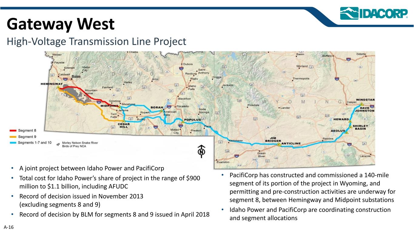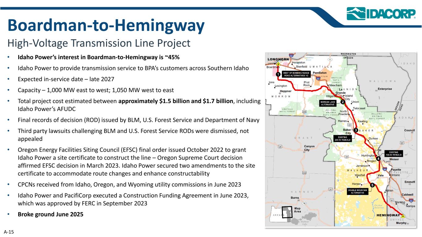 • Idaho Power在Boardman-To-Hemingway的权益约为45% • Idaho Power将为BPA在爱达荷州南部的客户提供输电服务•预计投入使用日期– 2027年末•容量–东西向1,000兆瓦;西向东向1,050兆瓦•项目总成本估计约为15亿美元至17亿美元,其中包括Idaho Power的AFUDC • BLM、美国林务局和海军部发布的最终决定记录(ROD)•对BLM和美国林务局ROD提出质疑的第三方诉讼被驳回,未上诉•俄勒冈州能源设施选址委员会(EFSC)于2022年10月发布最终命令,授予爱达荷电力公司建设该线路的选址证书——俄勒冈州最高法院的裁决确认了2023年3月的EFSC裁决。爱达荷电力公司获得了对场地证书的两项修订,以适应路线变化并增强可施工性• 2023年6月从爱达荷州、俄勒冈州和怀俄明州公用事业委员会收到的CPCN •爱达荷电力公司和PacifiCorp于2023年6月签署了建设资金协议,该协议于2023年9月获得FERC批准• 2025年6月破土动工Boardman-Hemingway高压输电线路项目A-15