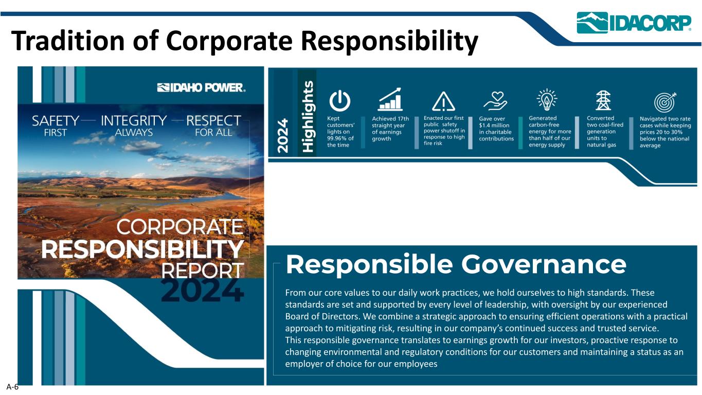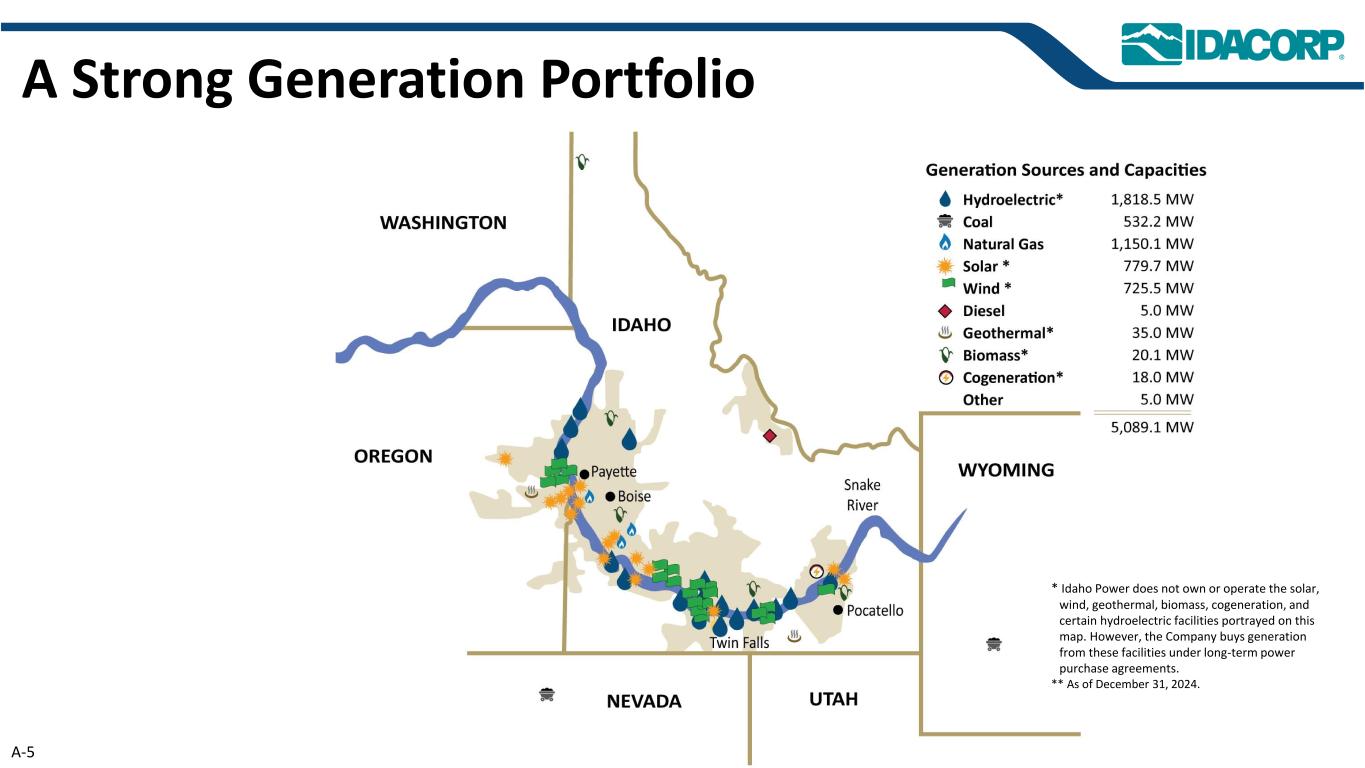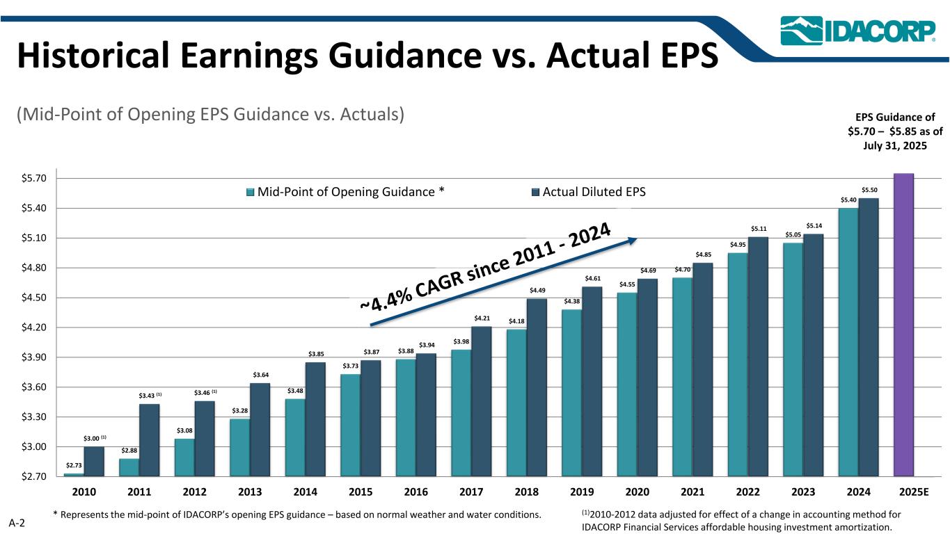 *代表IDACORP开盘EPS指引的中点–基于正常天气和水情。$ 2.73 $ 2.88 $ 3.08 $ 3.28 $ 3.48 $ 3.73 $ 3.88 $ 3.98 $ 4.18 $ 4.38 $ 4.55 $ 4.70 $ 4.95 $ 5.05 $ 5.40 $ 3.00(1)$ 3.43(1)$ 3.46(1)$ 3.64 $ 3.85 $ 3.87 $ 3.94 $ 4.21 $ 4.49 $ 4.61 $ 4.69 $ 4.85 $ 5.11 $ 5.14 $ 5.50 $ 2.70 $ 3.00 $ 3.30 $ 3.60 $ 3.90 $ 4.20 $ 4.50 $ 4.80 $ 5.10 $ 5.40 $ 5.70 2010201120122013201420152016201720182019202020212022202320242025E开盘指引中点*实际摊薄EPS(1)经会计方法变更影响调整的2010-2012年数据对于IDACORP金融服务保障性住房投资摊销。截至2025年7月31日,A-2历史盈利指引与实际EPS(开盘EPS指引中点与实际)EPS指引为5.70美元– 5.85美元
