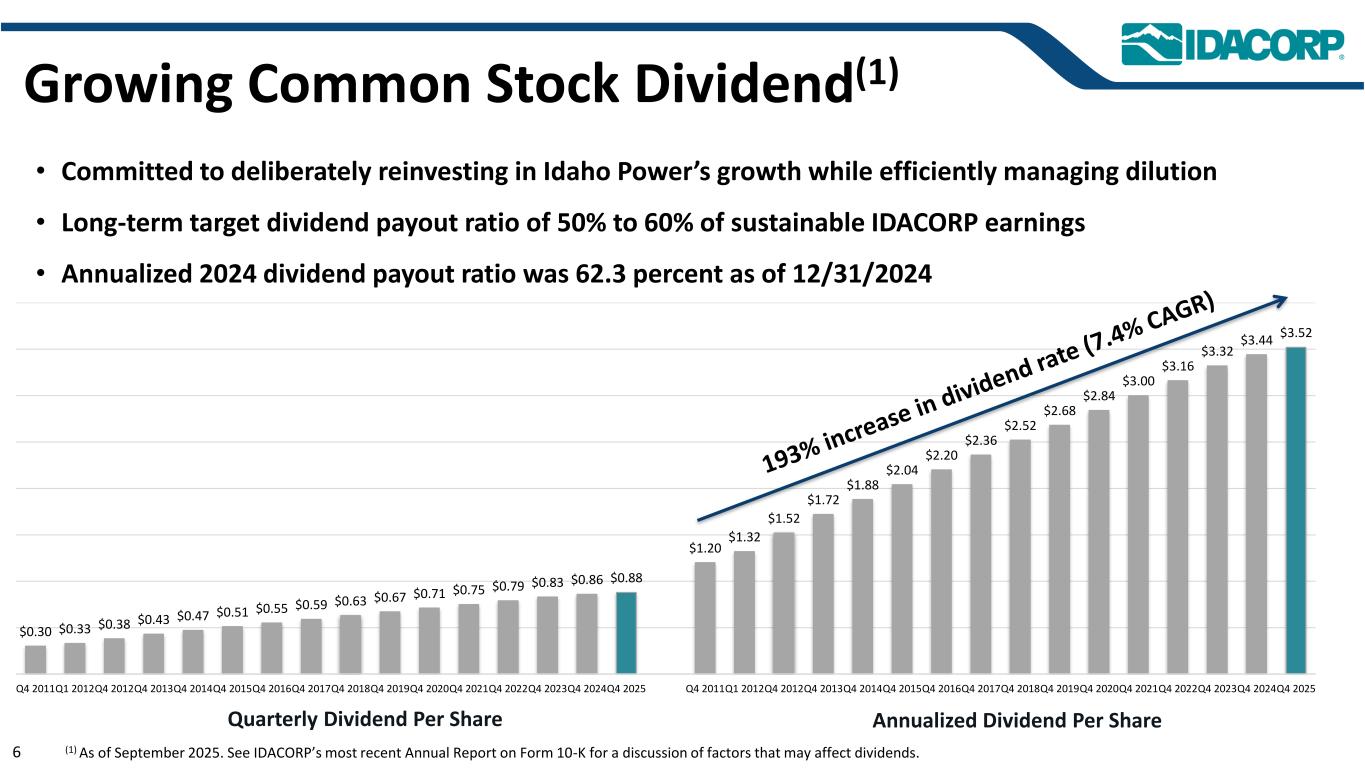 $ 0.30 $ 0.33 $ 0.38 $ 0.43 $ 0.47 $ 0.51 $ 0.55 $ 0.59 $ 0.63 $ 0.67 $ 0.71 $ 0.75 $ 0.79 $ 0.83 $ 0.86 $ 0.88 $ 1.20 $ 1.32 $ 1.52 $ 1.72 $ 1.88 $ 2.04 $ 2.20 $ 2.36 $ 2.52 $ 2.68 $ 2.84 $ 3.00 $ 3.16 $ 3.32 $ 3.44 $ 3.52 Q4 2011Q1 2012Q4 2012Q4 2013Q4 2014Q4 2015Q4 2016Q4 2017Q4 2018Q4 2019Q4 2020Q4 2021Q4 2022Q4 2023Q4 2024Q4 2025Q4 2011Q1 2012Q4 2012Q4 2013Q4 2014Q4 2015Q4 2016Q4 2017Q4 2018Q4 2019Q4 2020Q4 2021Q4 2022Q4 2023Q4 2024Q4 2025 •致力于有意再投资于爱达荷电力的增长同时高效管理稀释•长期目标股息支付率为可持续IDACORP收益的50%至60% •截至2024年12月31日,2024年年化股息支付率为62.3%,增长的普通股股息(1)截至2025年9月的6个季度每股股息年化每股股息(1)。有关可能影响股息的因素的讨论,请参阅IDACORP最近的10-K表格年度报告。