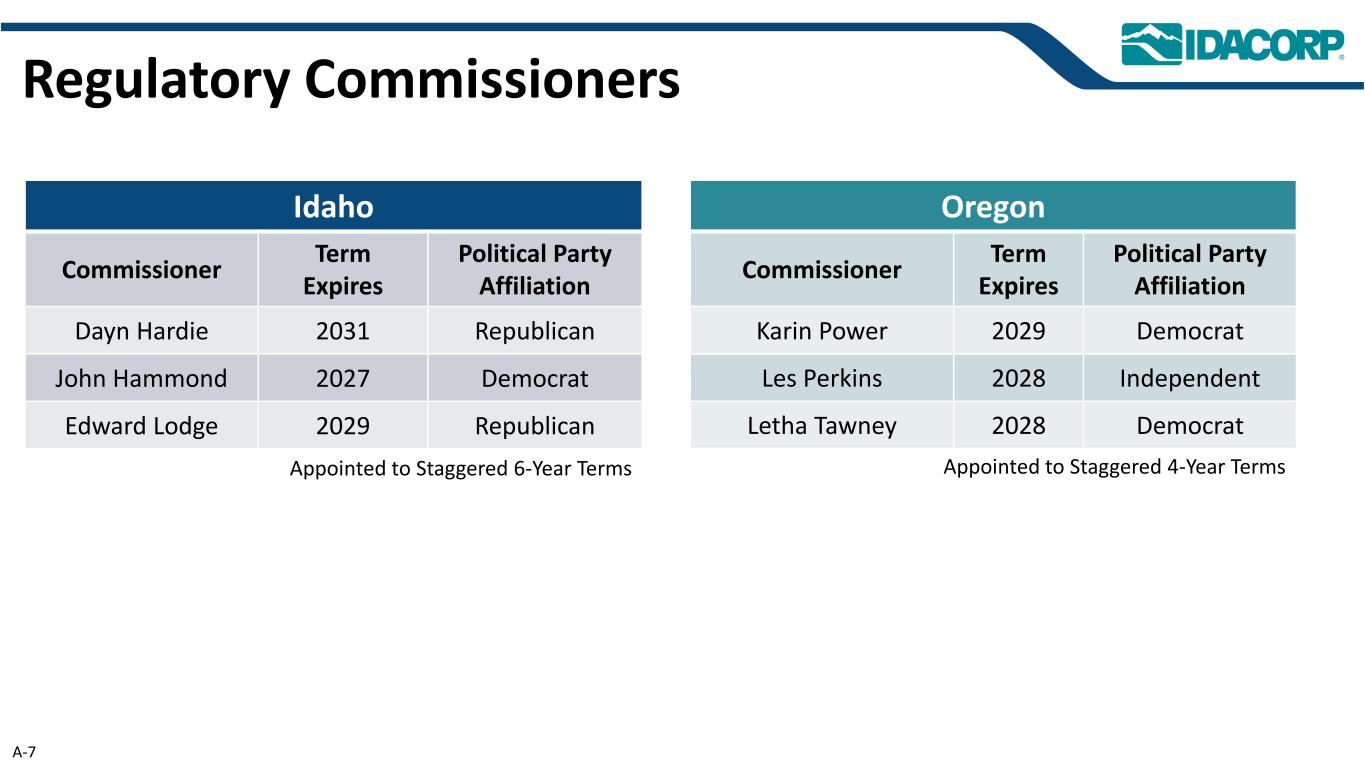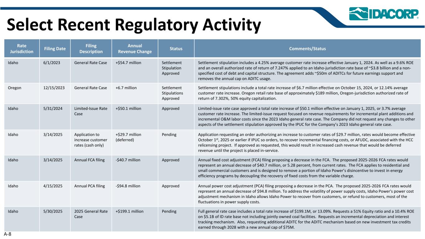 选择最近的监管活动率辖区提交日期提交说明年度收入变化状态评论/状态爱达荷州6/1/2023一般费率案例+ 5470万美元结算规定批准的结算规定包括4.25%的平均客户费率上调,自2024年1月1日起生效。以及9.6%的ROE和7.247%的整体授权收益率适用于约38亿美元的爱达荷州辖区利率基数以及未指定的债务和资本结构成本。该协议为未来的收益支持增加了约5000万美元的ADITC,并取消了ADITC使用的年度上限。俄勒冈州12/15/2023一般费率案例+ 670万结算规定批准的结算规定包括2024年10月15日生效的总费率增加670万美元,或12.14%的平均客户费率增加。俄勒冈州零售费率基数约为1.89亿美元,俄勒冈州辖区授权收益率为7.302%,50%股权资本化。爱达荷州5/31/2024限定发行利率案例+ 5010万美元获批限定发行利率案例批准总额为5010万美元的利率上调,自2025年1月1日起生效,即平均客户利率上调3.7%。这份限量发行的请求侧重于自2023年爱达荷州通用费率案以来增加的工厂和增加的O & M劳动力成本的收入要求。公司没有要求对IPUC批准的关于公司2023年爱达荷州一般费率案件的和解规定的其他方面进行任何变更。爱达荷州3/14/2025申请提高客户费率(仅限现金)+ 2970万美元(延期)待处理申请请求订单授权提高客户费率2970万美元,如果IPUC这样做,费率将于2025年10月1日或更早生效,以收回与HCC再许可项目相关的增量融资成本或AFUDC。如果按要求获得批准,这将导致现金收入增加,这将是递延收入,直到项目投入使用。爱达荷州3/14/2025年度FCA备案-4070万美元批准年度固定成本调整(FCA)备案,提议降低FCA。拟议的2025-2026年FCA费率将比目前的费率每年减少4070万美元,即5.28%。该FCA适用于住宅和小型商业客户,旨在通过将固定成本的回收与可变费用脱钩,消除爱达荷电力公司投资于能效计划的部分抑制因素。爱达荷州4/15/2025年度PCA申报-9480万美元批准年度电力成本调整(PCA)申报,提议降低PCA。拟议的2025-2026年FCA费率每年将减少9480万美元。为了解决供电成本的波动问题,爱达荷电力在爱达荷州的电力成本调整机制允许爱达荷电力从客户那里收回,或者退还给客户大部分供电成本的波动。爱达荷州5/30/20252025一般费率案例+ 1.991亿美元待付全额一般费率案例包括1.991亿美元的总费率增加,即13.09%。请求51%的股权比率和10.4%的ROE10.4在$ 5.1B的ID率基础上,不包括共同拥有的煤炭设施。要求建立增量折旧和利息跟踪机制。此外,请求为ADITC机制提供额外的ADITC,该机制基于到2028年获得的新投资税收抵免,新的年度上限为7500万美元。A-8