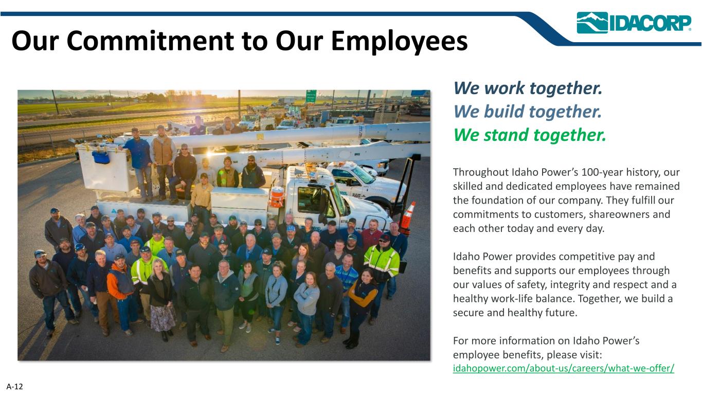 A-12我们一起工作。我们一起建设。我们站在一起。纵观爱达荷电力公司100年的历史,我们技术娴熟、尽职尽责的员工始终是我们公司的根基。他们今天和每一天都在履行我们对客户、股东和彼此的承诺。爱达荷电力提供有竞争力的薪酬和福利,并通过我们的安全、诚信和尊重的价值观以及健康的工作与生活平衡来支持我们的员工。我们携手共进,共筑平安健康未来。有关爱达荷电力公司员工福利的更多信息,请访问:idahopower.com/about-us/careers/what-we-offer/我们对员工的承诺